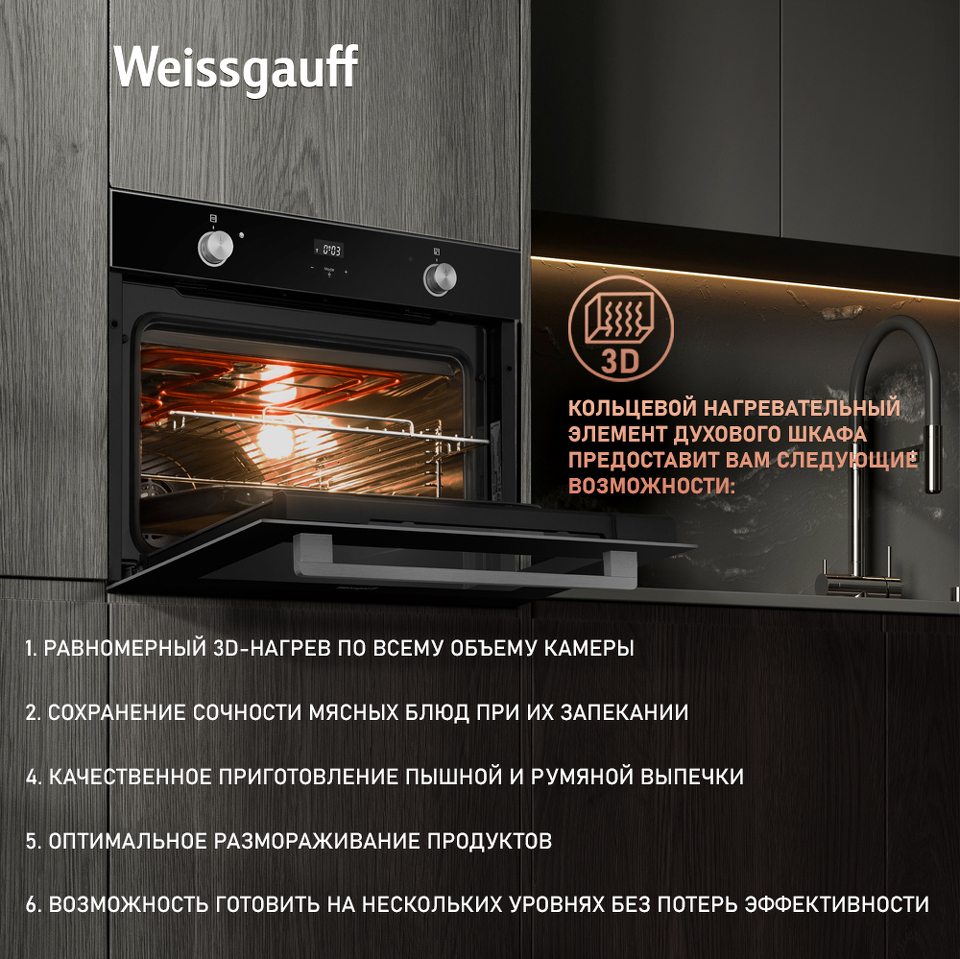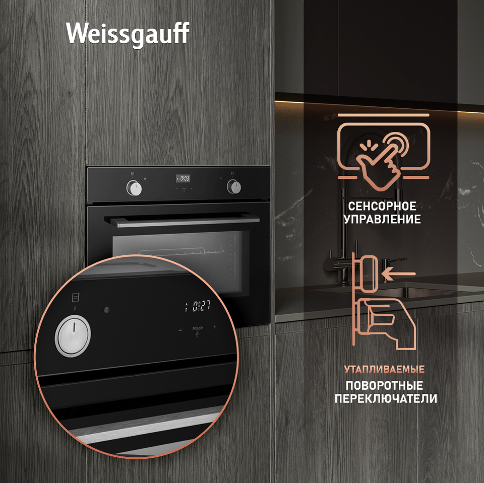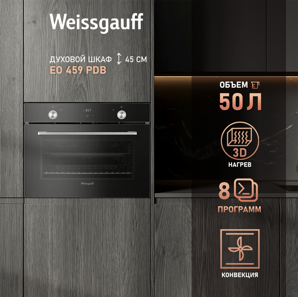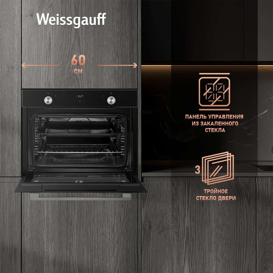 Компактный духовой шкаф от Weissgauff, оснащенный тройным стеклом и выполненный в чёрном цвете - это впечатляющий функционал, воплощенный в невероятно эргономичном устройстве!