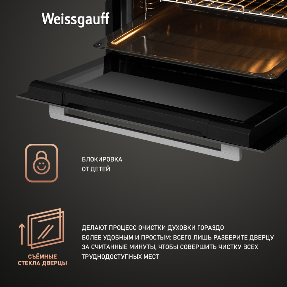Объем 50 литров дает вам полную уверенность в том, что несмотря на компактные размеры этого духового шкафа, вы сможете разместить в нем сразу весь необходимый объем пищи, порадовав себя и своих близких изысканными блюдами, приготовленными в духовом шкафу Weissgauff на действительно ресторанном уровне.