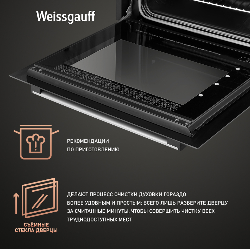 Двойное стекло дверцы, воплощающее в себе весь подход к безопасности и термозащите, который Weissgauff реализовали в данной модели. Теперь случайные прикосновения к дверце духового шкафа во время процесса приготовления еды больше будут не страшны, ведь мы позаботились о том, чтобы фронтальная сторона духового шкафа никогда не нагревалась до опасных температур.