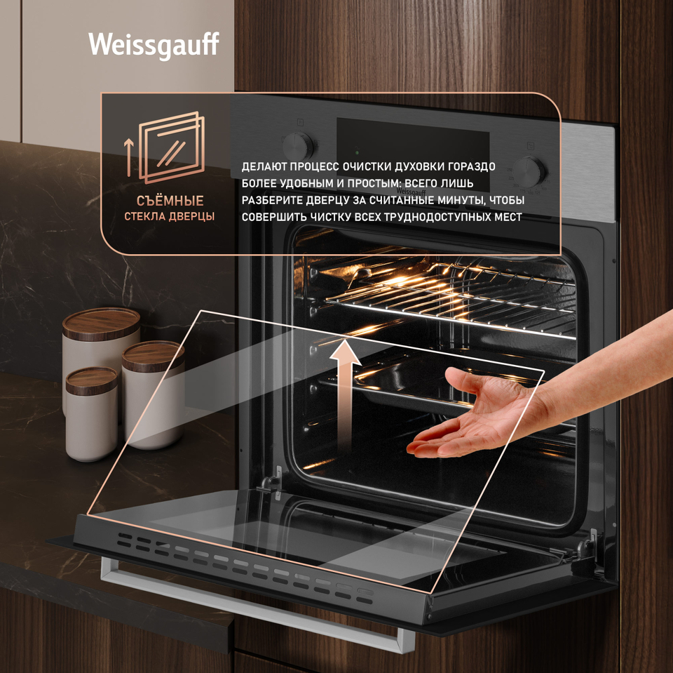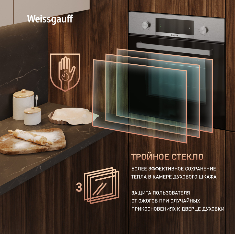 Тройное стекло дверцы, воплощающее в себе весь подход к безопасности и термозащите, который Weissgauff реализовали в данной модели. Такое стекло обеспечивает вам значительно большую степень защиты при случайных прикосновениях к нагревающейся дверце плиты, чем в моделях, не оснащенных технологией многослойного стекла. Для нас в Weissgauff важно, чтобы работа с бытовой техникой была не только приятной, но и безопасной!