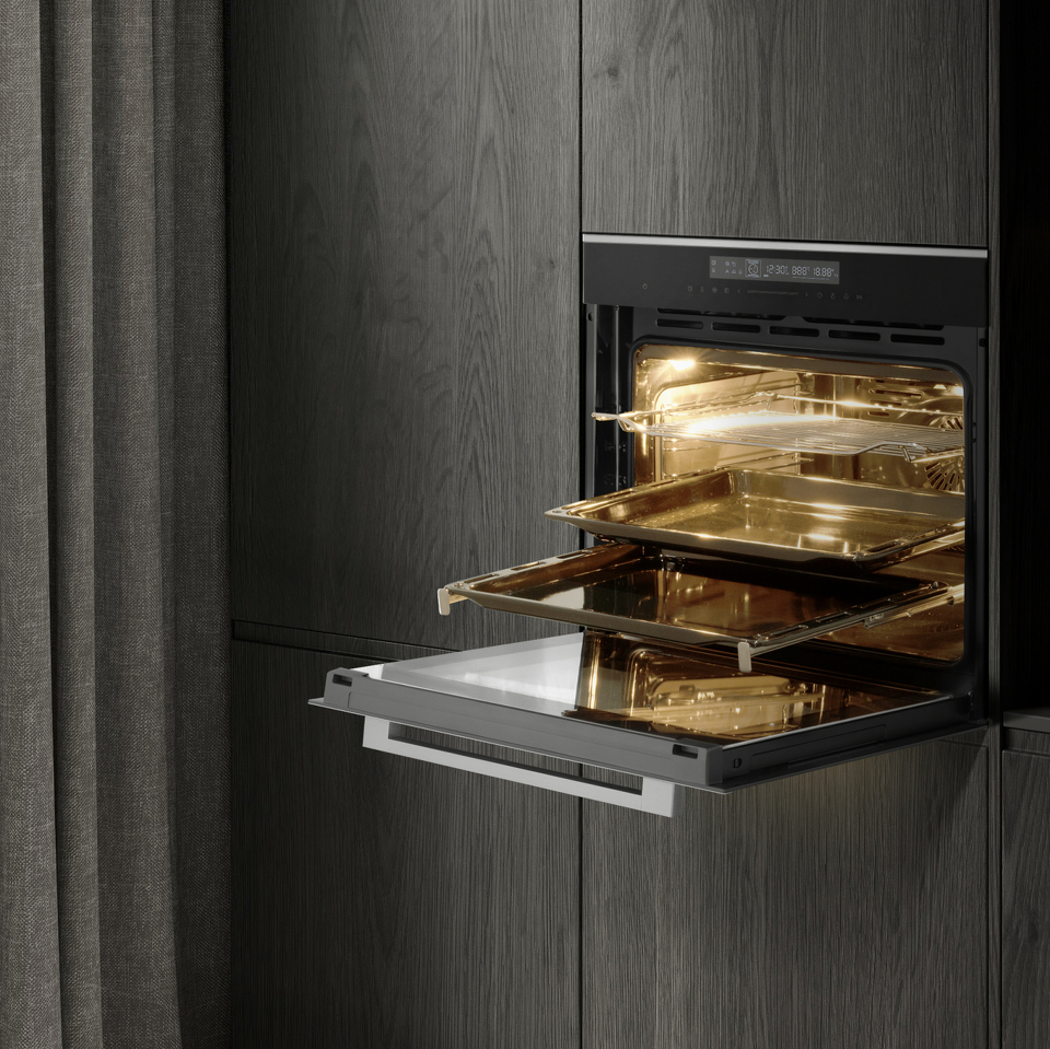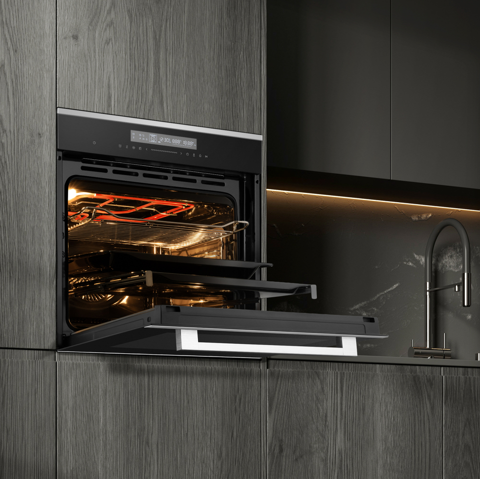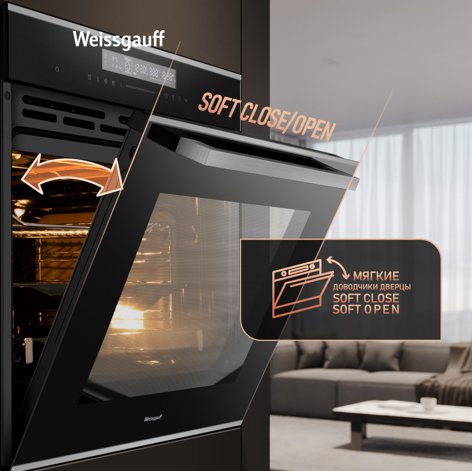 Мягкие доводчики дверцы SOFT CLOSE + SOFT OPEN, позволят защитить ваш духовой шкаф от повреждений при случайном захлопывании дверцы устройства, а также обеспечить мягкое и плавное открытие, когда вам необходим доступ к камере. Реализованная нами в данной модели технология позволяет погасить вибрацию, уменьшить нагрузку на дверцу и корпус духового шкафа, автоматически доводя дверцу мягким и плавным движением.