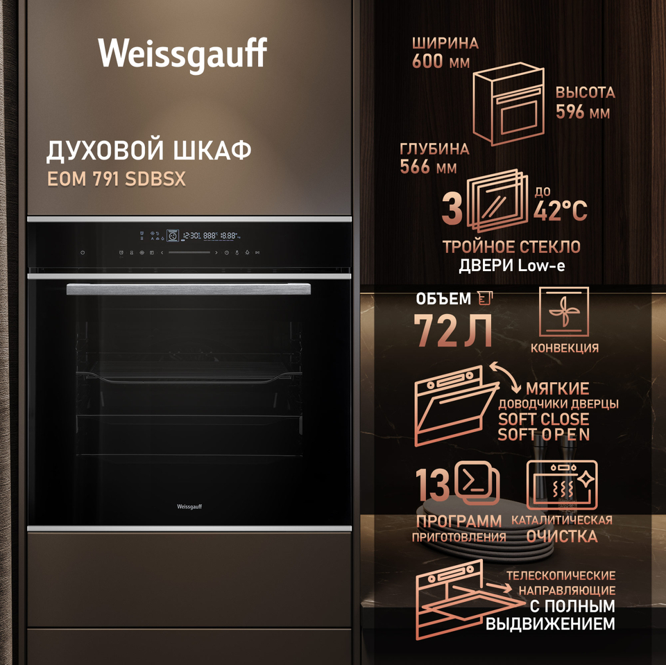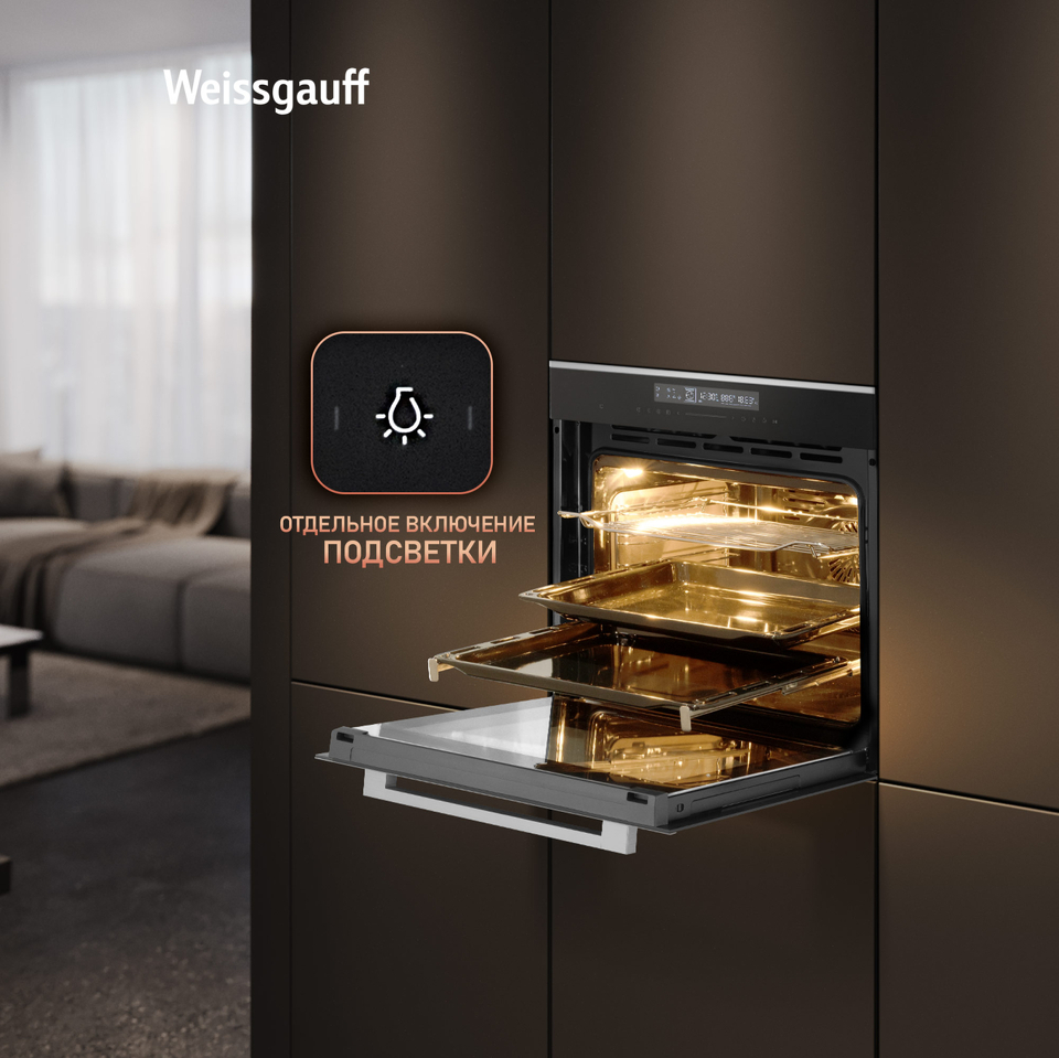 Объем XL 72 литра дает вам полную уверенность в том, что приобретая этот духовой шкаф, вы сможете разместить в нем сразу весь необходимый объем пищи, и даже профессионально работать на нескольких уровнях одновременно, порадовав себя и своих близких настоящим пиром, приготовленным в духовом шкафу Weissgauff на действительно ресторанном уровне.