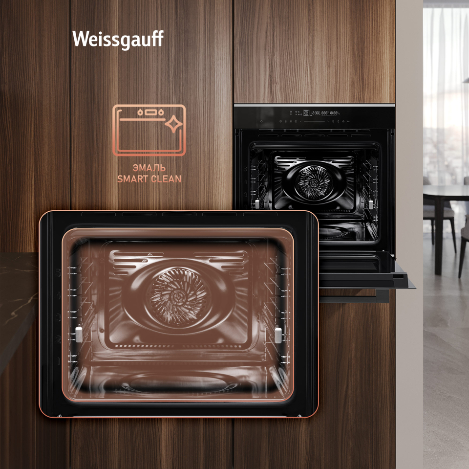 Эмаль SMART CLEAN - это особое покрытие духового шкафа, призванное сделать процесс ухода за ним еще более простым и удобным. Благодаря эмали, изготовленной и нанесенной с применением сразу ряда инновационных технологий, ваш духовой шкаф будет оснащен самым настоящим высокоэффективным щитом, препятствующим накоплению жира, запаха и загрязнений, образующихся вследствие многократного приготовления еды.