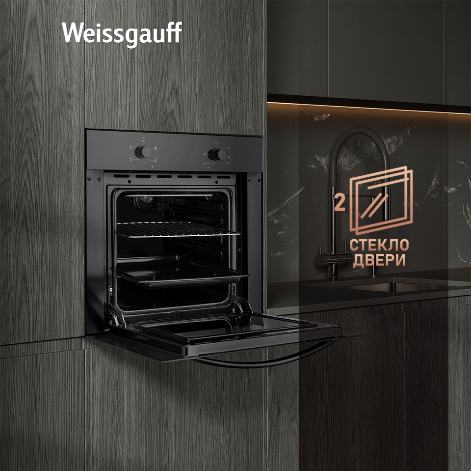 Электрический духовой шкаф от Weissgauff, выполненный в чёрном цвете с панелью из закаленного стекла, оснащённый 4 функциями приготовления и механическими поворотными рукоятками Soft Switch и двойным остеклением дверцы - это сочетание доступности и практичности в одном устройстве!