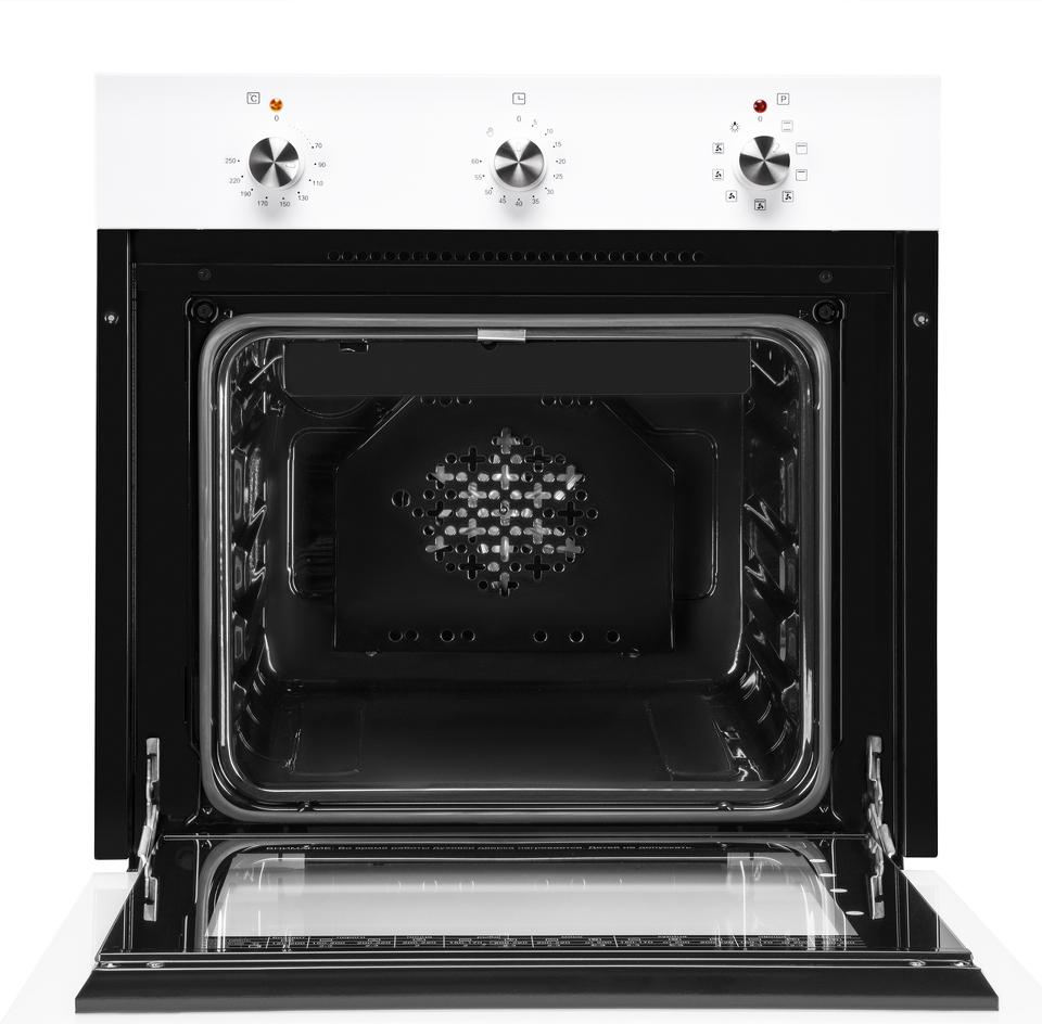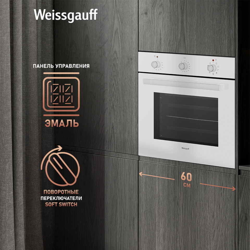 Электрический духовой шкаф от Weissgauff, выполненный в белом цвете, оснащённый механическими поворотными рукоятками Soft Switch, двойным остеклением дверцы и 9 режимами, буквально олицетворяет собой уверенность в надёжном и функциональном оснащении вашей кухни!