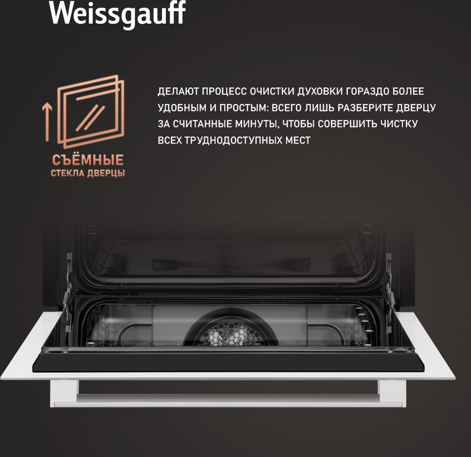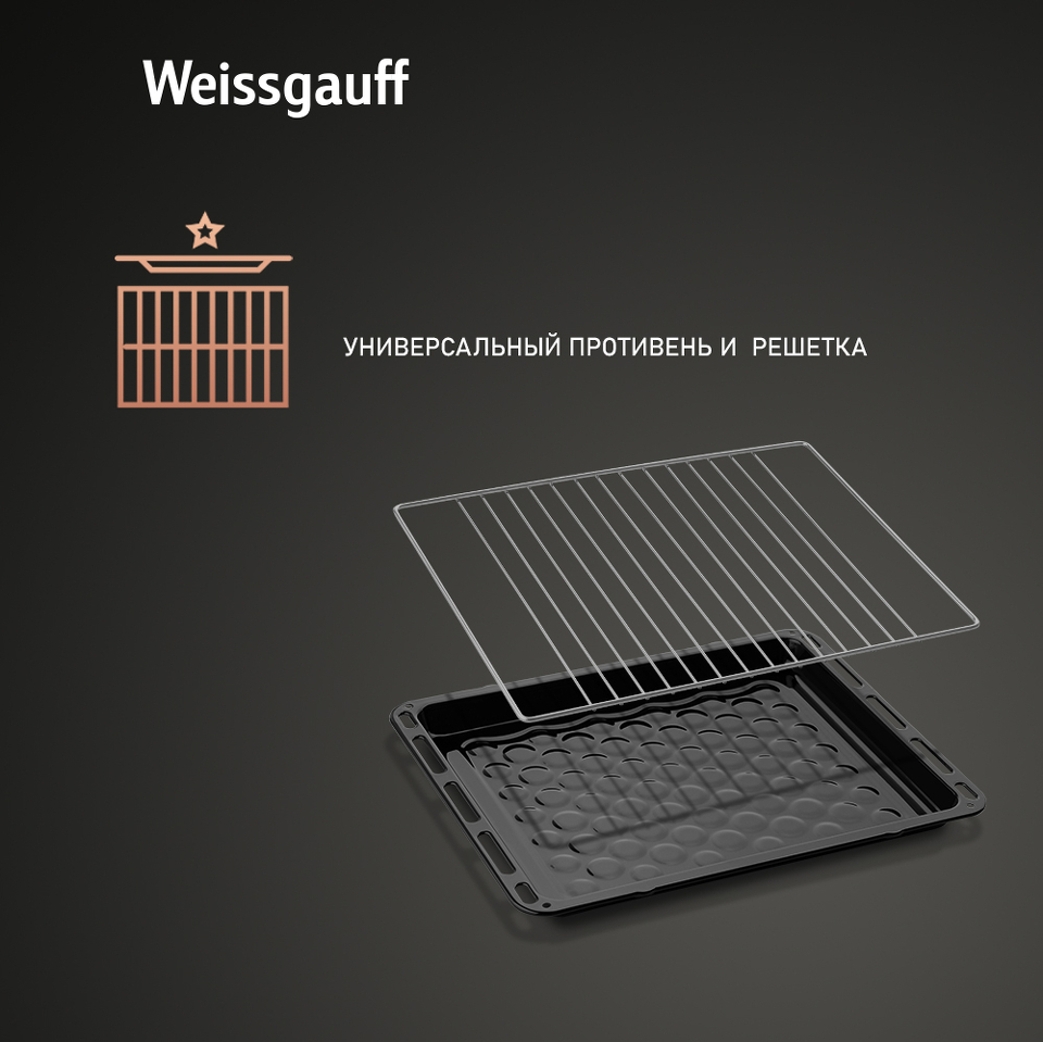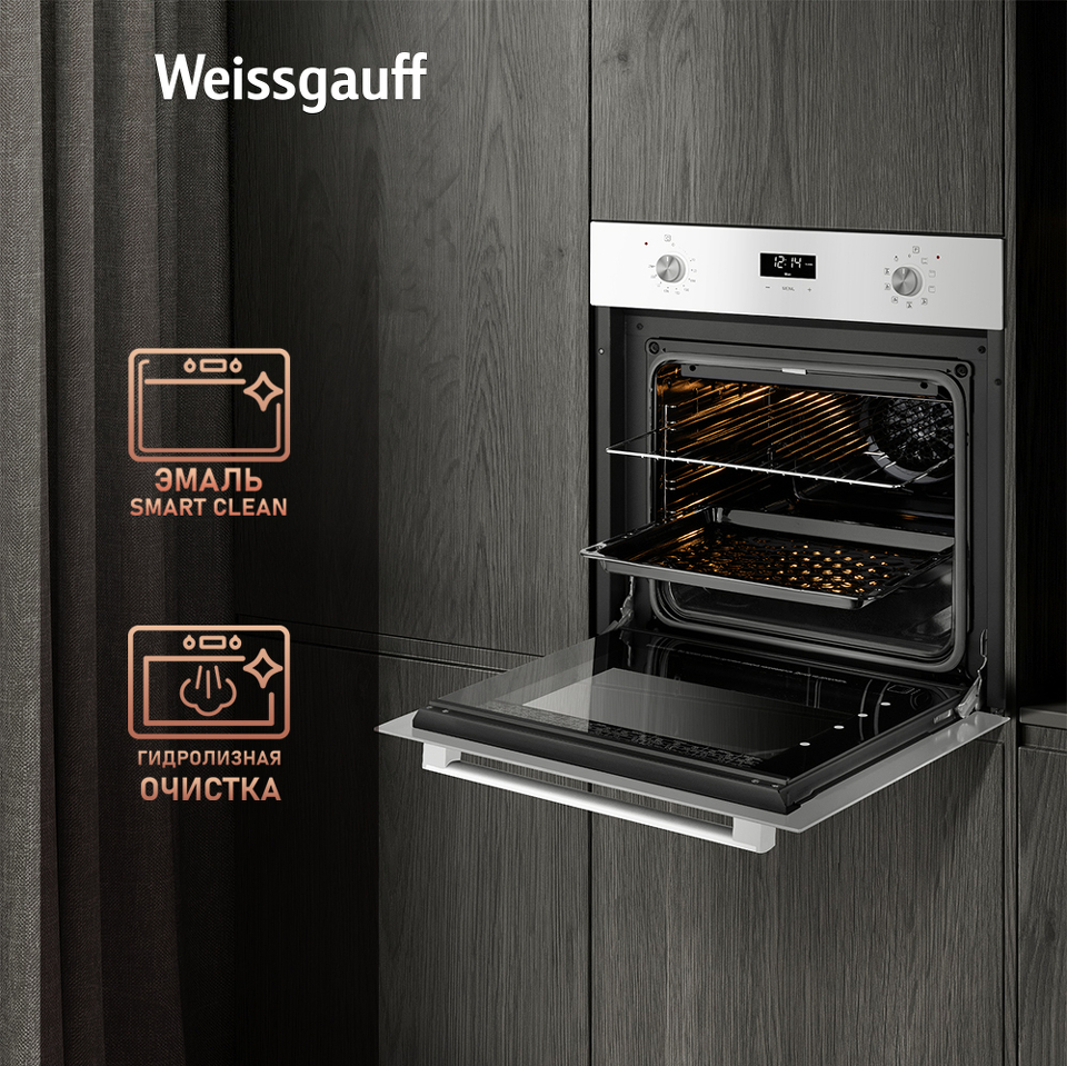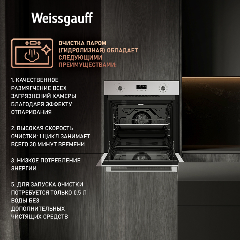 • Гидролизная очистка - особая технология, благодаря который вы раз и навсегда забудете те дни, когда духовой шкаф необходимо было с большим трудом вычищать, вкладывая в это непозволительно много времени и сил. Weissgauff понимает, что в современном мире время является одной из наивысших ценностей - поэтому мы оснастили данную модель функцией гидролиза: всего лишь добавьте небольшое количество воды, и духовой шкаф сам отпарит все загрязнения, используя "эффект сауны", после чего вам останется лишь провести по стенкам мягкой губкой, собрав их и удалив одним движением.