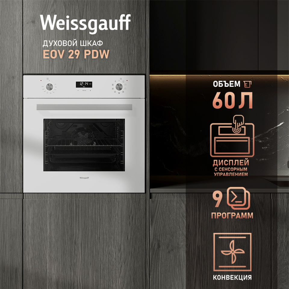 Электрический духовой шкаф от Weissgauff, выполненный в белом цвете, оснащён чувствительным сенсорным управлением, утапливаемыми рукоятками PIPO и 9 режимами, каждый из которых раскроет для вас новые возможности приготовления вкуснейших блюд!