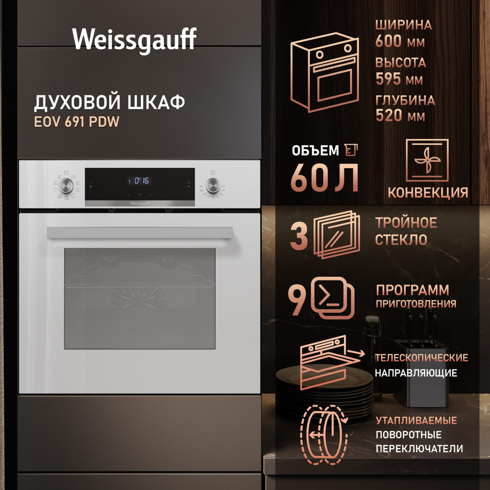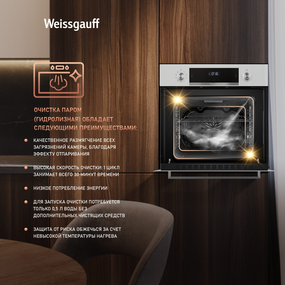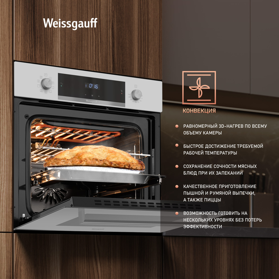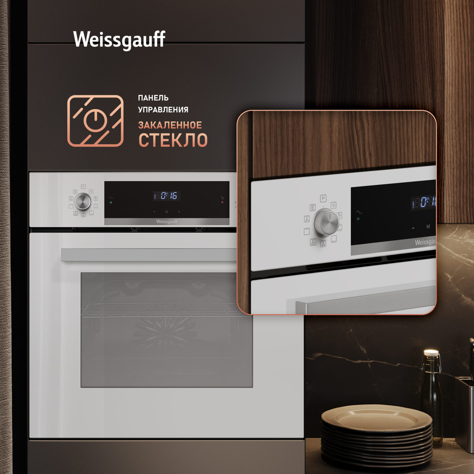 Новое поколение духовых шкафов от Weissgauff предлагает духовой шкаф, выполненный в великолепном дизайне белого закаленного стекла, имеющий дисплей с чувствительным сенсорным управлением. Тройное остекление дверцы отражает всю ту предусмотрительность, с которой мы подошли к её созданию. Утапливаемые рукоятки PIPO, дополняет богатый функционал, представленный сразу 9 режимами! Благодаря всему этому вы сможете полностью управлять процессом приготовления пищи, добиваясь идеального результата каждый раз!