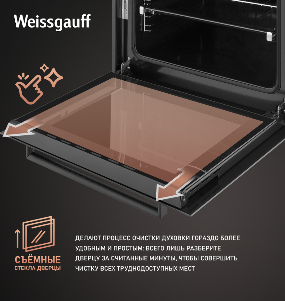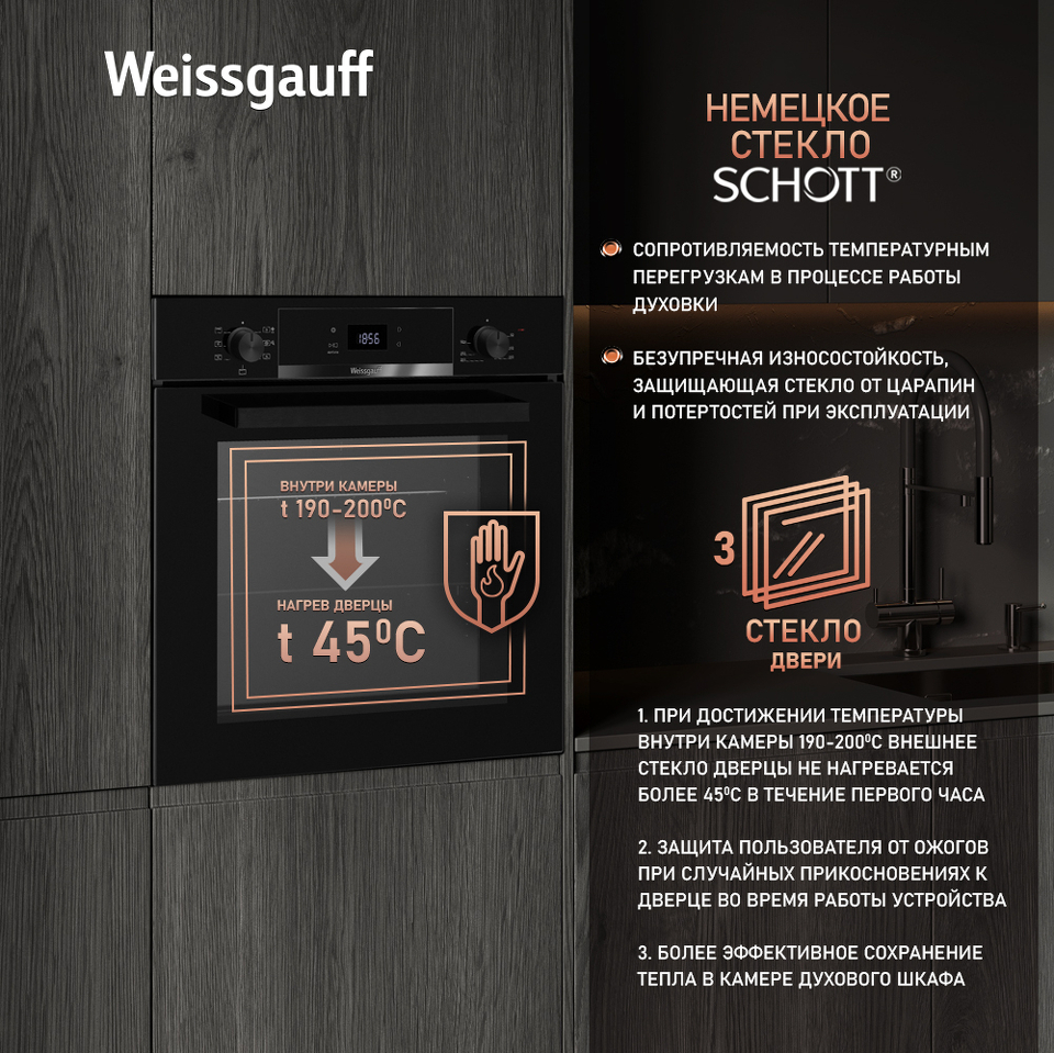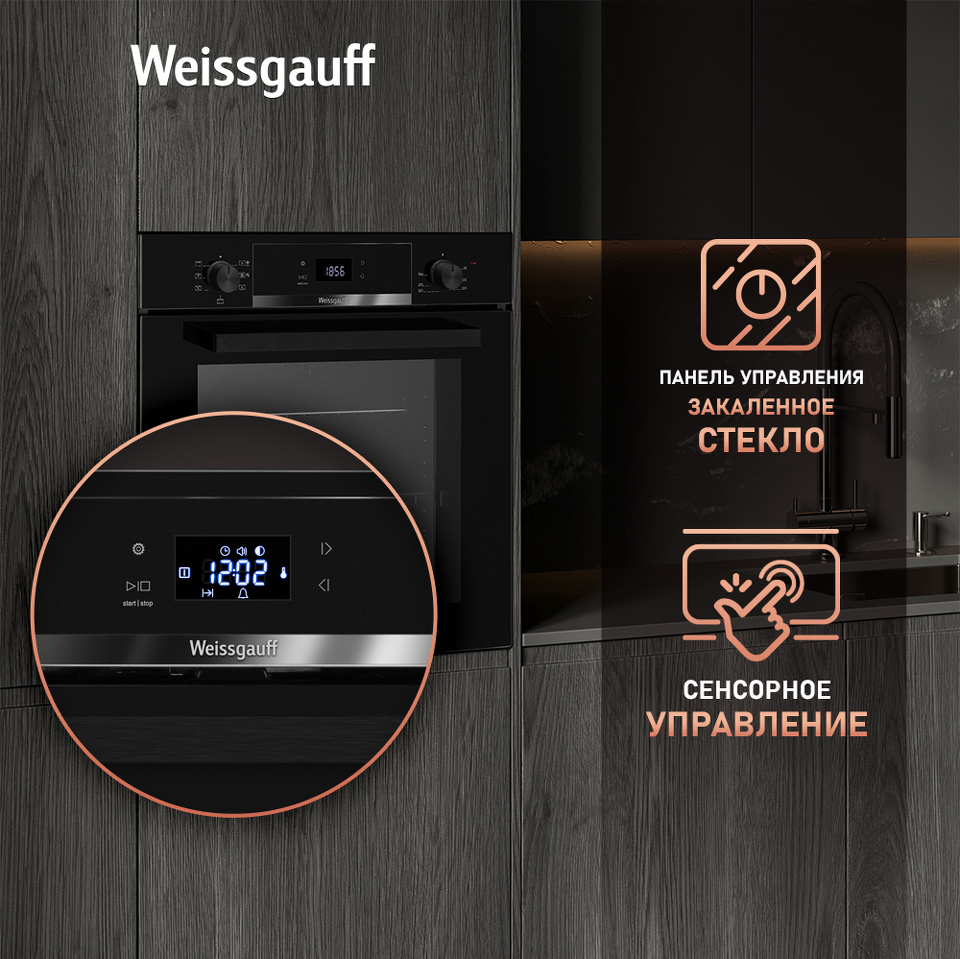 Великолепный дизайн, дополненный вставкой из стекла под дисплеем, станет финальным штрихом в совершенстве облика этой модели. Каждый раз, взаимодействуя с духовым шкафом от Weissgauff, вы будете в полной мере ощущать, как он способен нагревать не только еду, но и согревать душу, став настоящим сердцем вашего уютного домашнего очага