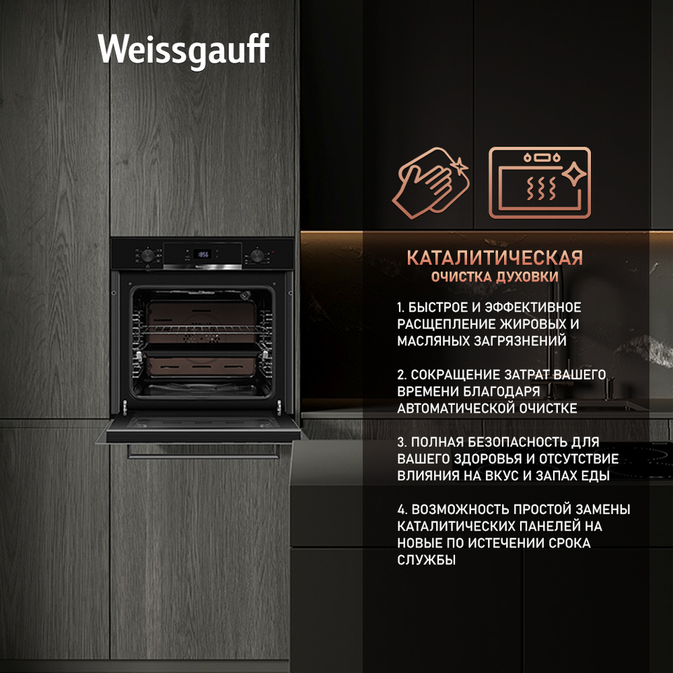 Новое поколение электрических духовых шкафов от Weissgauff предлагает модель, выполненную в черном цвете. Управление, реализованное сочетанием чувствительного сенсорного блока и утапливаемых черных рукояток PIPO, дополняет богатый функционал, представленный сразу 7 режимами! А фантастический увеличенный объем XL 72 литра дополнит совершенство возможностей этого устройства! Благодаря всему этому вы сможете полностью управлять процессом приготовления пищи, добиваясь идеального результата каждый раз! Духовой шкаф Weissgauff станет не только отличным приобретением для вашей кухни, но и настоящим украшением интерьера, отражающим все благородство вашего вкуса и стиля!