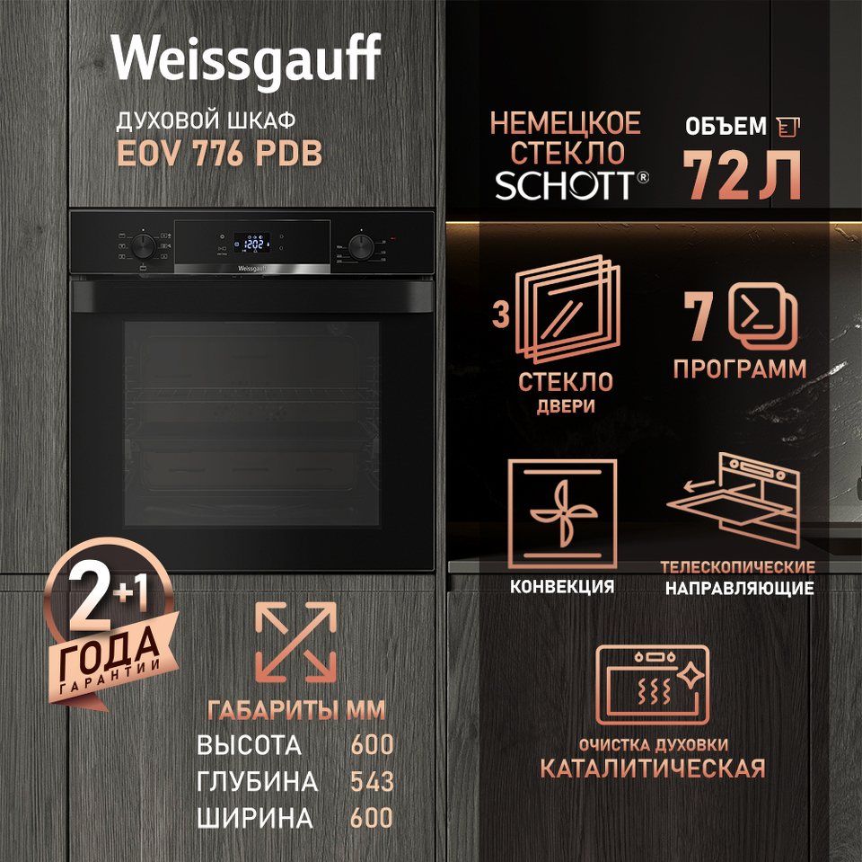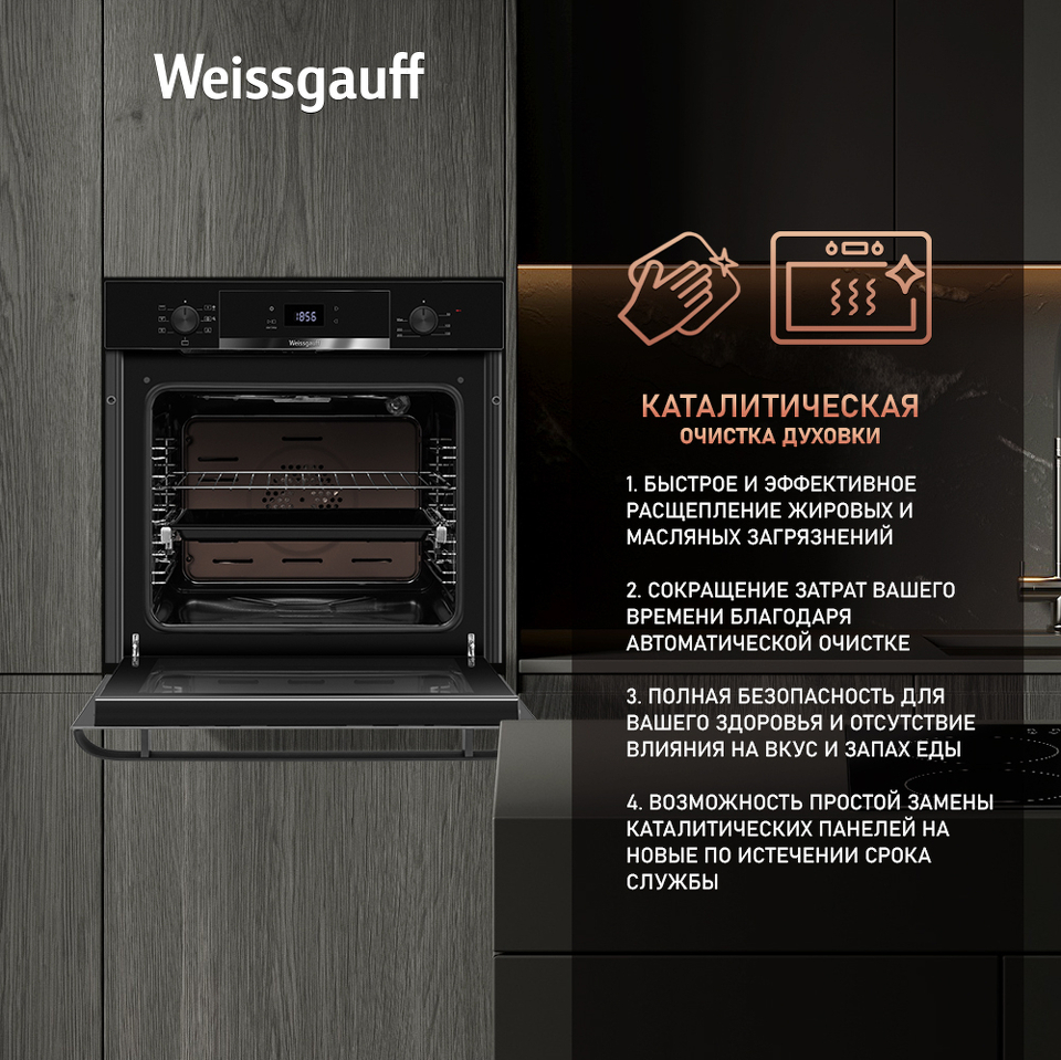 Новое поколение электрических духовых шкафов от Weissgauff предлагает модель, выполненную в черном цвете в дизайне BLACK EDITION. Управление, реализованное сочетанием чувствительного сенсорного блока и утапливаемых черных рукояток PIPO, дополняет богатый функционал, представленный сразу 7 режимами! А фантастический увеличенный объем XL 72 литра дополнит совершенство возможностей этого устройства! Благодаря всему этому вы сможете полностью управлять процессом приготовления пищи, добиваясь идеального результата каждый раз! Духовой шкаф Weissgauff станет не только отличным приобретением для вашей кухни, но и настоящим украшением интерьера, отражающим все благородство вашего вкуса и стиля!