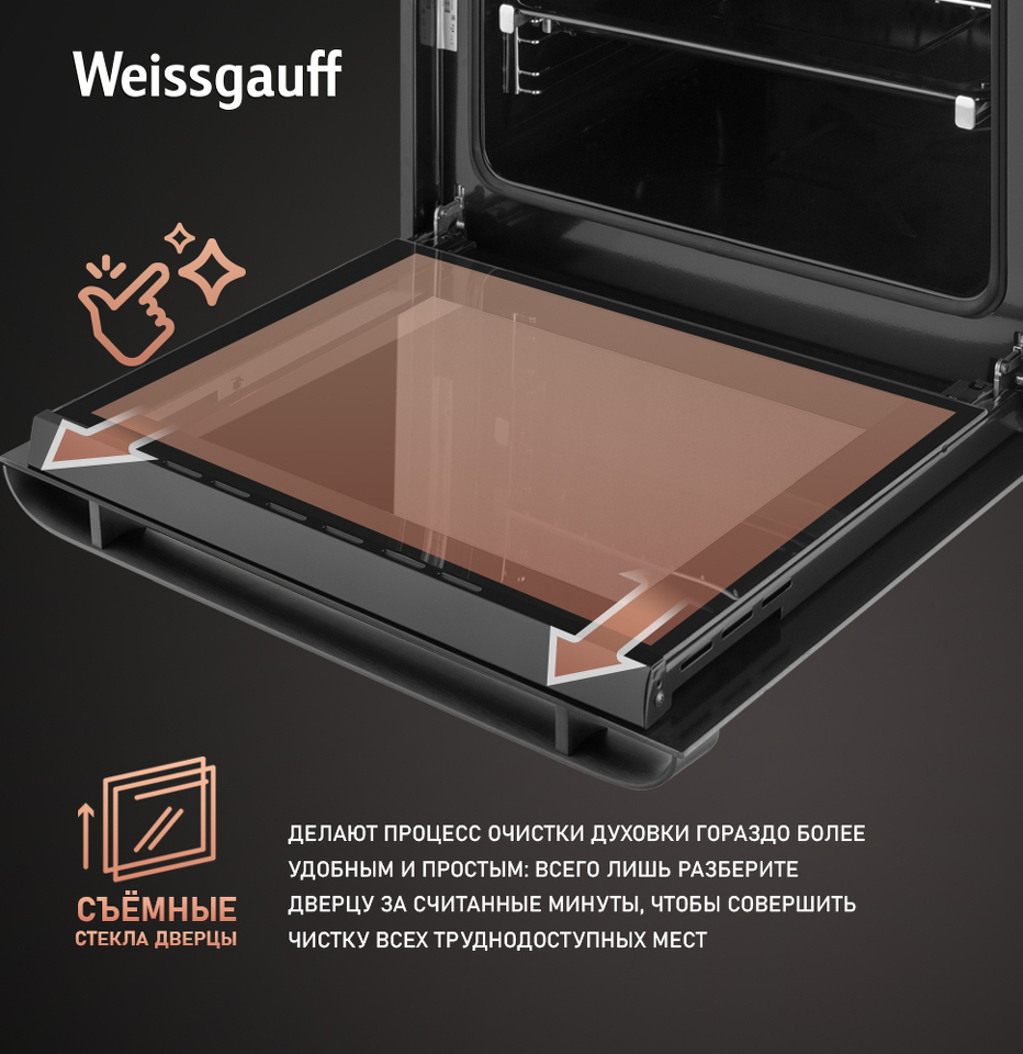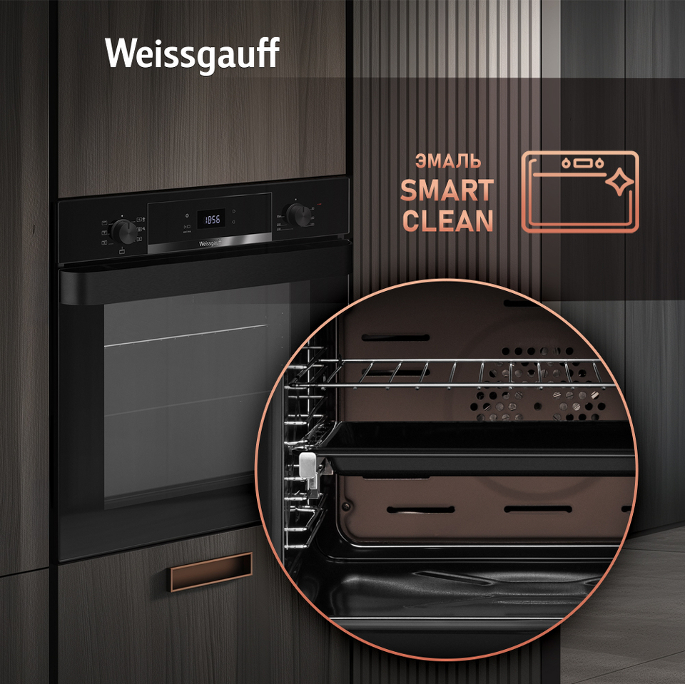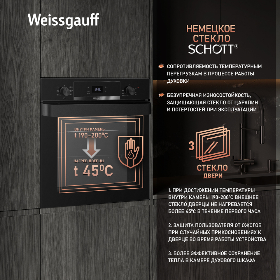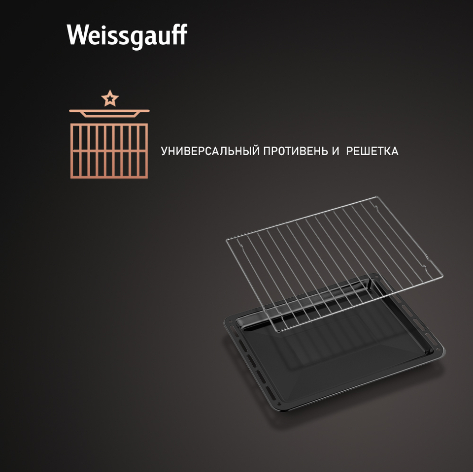 Великолепный дизайн, дополненный вставкой из стекла под дисплеем, станет финальным штрихом в совершенстве облика этой модели. Каждый раз, взаимодействуя с духовым шкафом от Weissgauff, вы будете в полной мере ощущать, как он способен нагревать не только еду, но и согревать душу, став настоящим сердцем вашего уютного домашнего очага