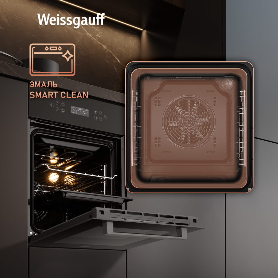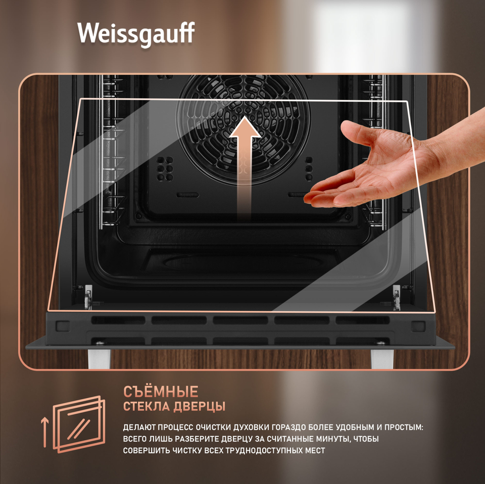 • Гидролизная очистка - особая технология, благодаря который вы раз и навсегда забудете те дни, когда духовой шкаф необходимо было с большим трудом вычищать, вкладывая в это непозволительно много времени и сил. Weissgauff понимает, что в современном мире время является одной из наивысших ценностей - поэтому мы оснастили данную модель функцией гидролиза: всего лишь добавьте небольшое количество воды, и духовой шкаф сам отпарит все загрязнения, используя "эффект сауны", после чего вам останется лишь провести по стенкам мягкой губкой, собрав их и удалив одним движением.