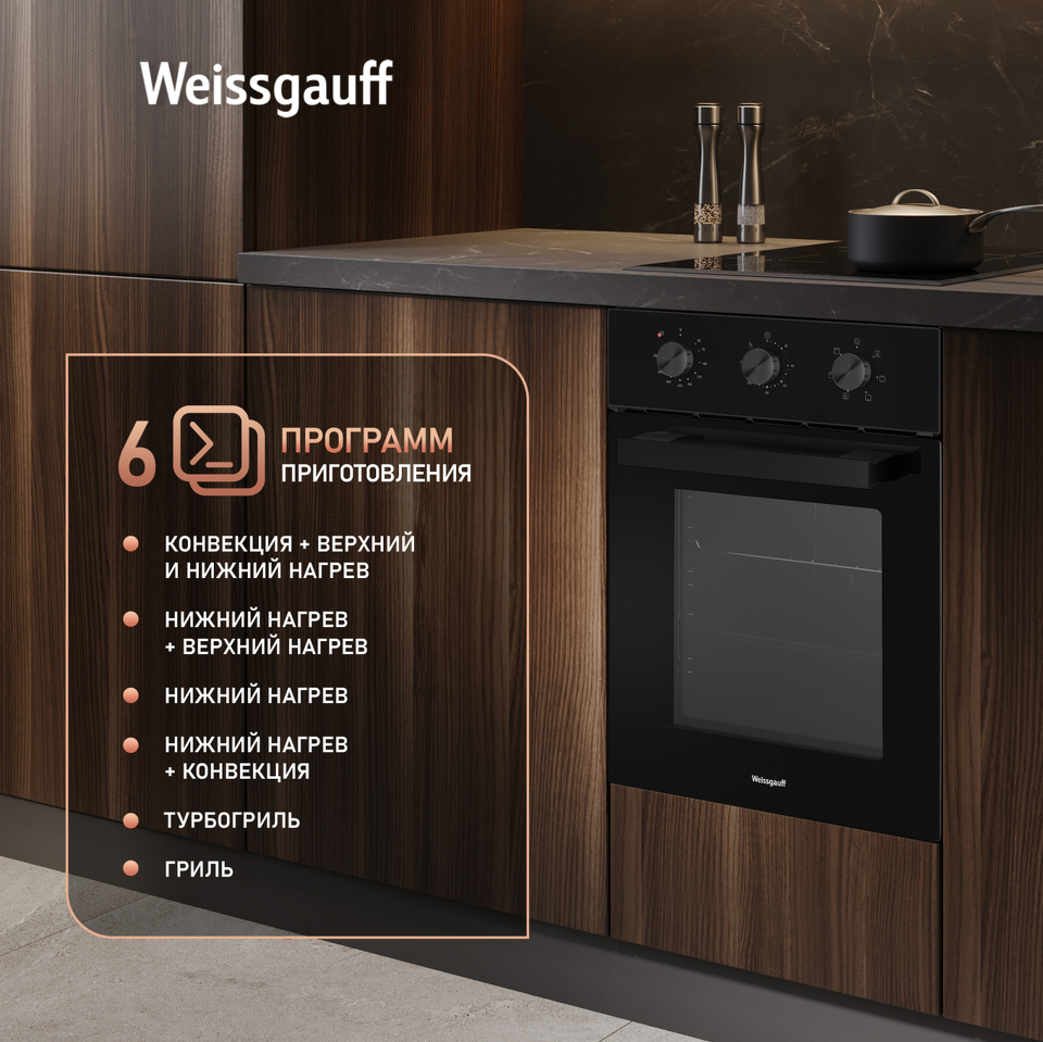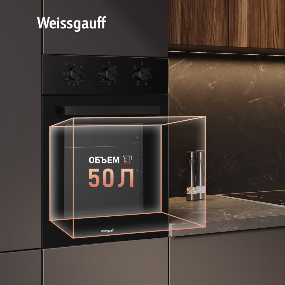 Объем 50 литров дает вам полную уверенность в том, что приобретая этот духовой шкаф, вы сможете разместить в нем сразу весь необходимый объем пищи, и даже профессионально работать на нескольких уровнях одновременно, порадовав себя и своих близких настоящим пиром, приготовленным в духовом шкафу Weissgauff на действительно ресторанном уровне.