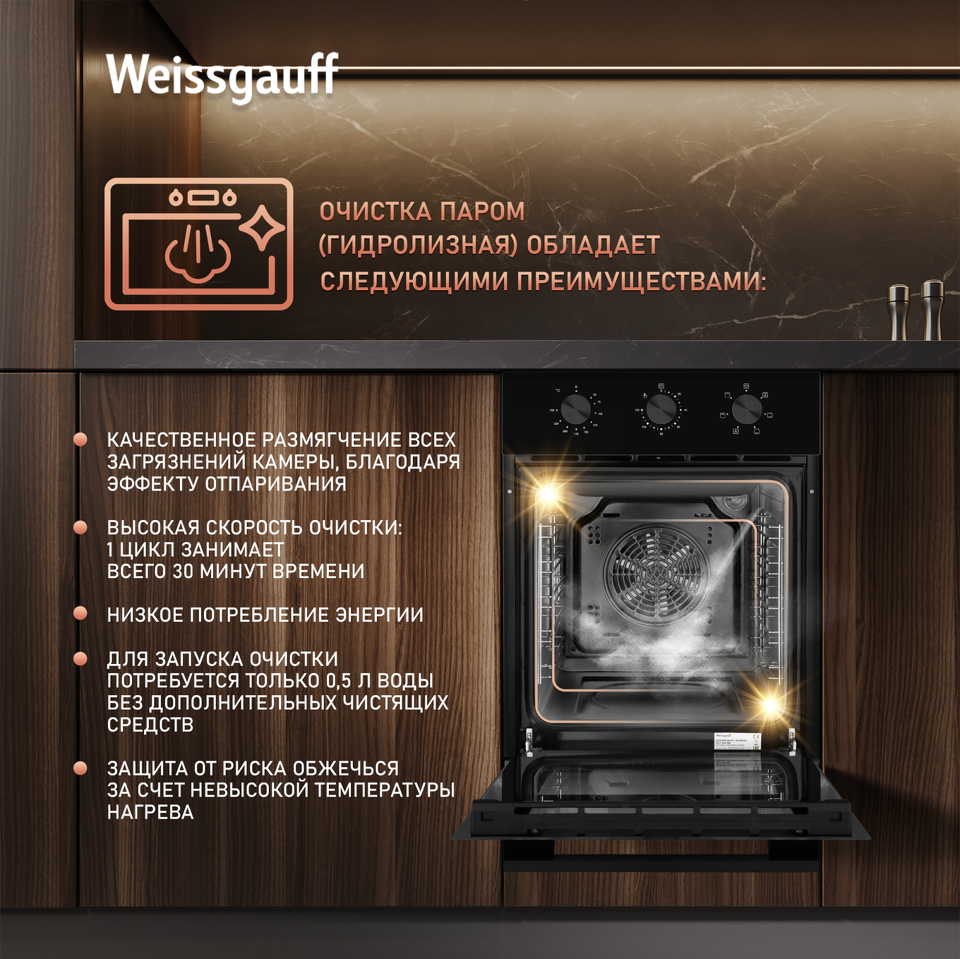 Гидролизная очистка - особая технология, благодаря который вы раз и навсегда забудете те дни, когда духовой шкаф необходимо было с большим трудом вычищать, вкладывая в это непозволительно много времени и сил. Weissgauff понимает, что в современном мире время является одной из наивысших ценностей - поэтому мы оснастили данную модель функцией гидролиза: всего лишь добавьте небольшое количество воды, и духовой шкаф сам отпарит все загрязнения, используя "эффект сауны", после чего вам останется лишь провести по стенкам мягкой губкой, собрав их и удалив одним движением.