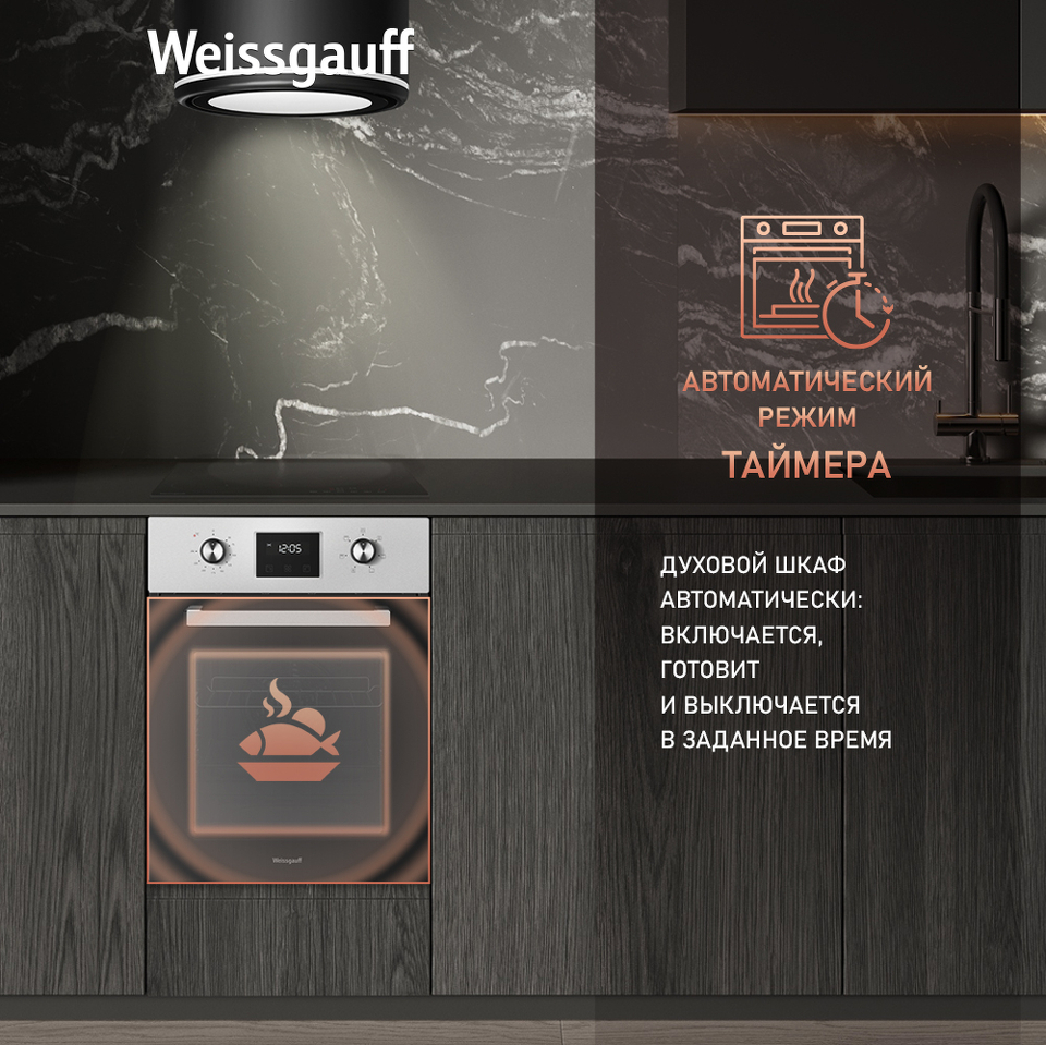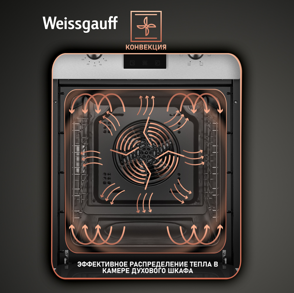 Объем 50 литров дает вам полную уверенность в том, что приобретая этот духовой шкаф, вы сможете разместить в нем сразу весь необходимый объем пищи, и даже профессионально работать на нескольких уровнях одновременно, порадовав себя и своих близких настоящим пиром, приготовленным в духовом шкафу Weissgauff на действительно ресторанном уровне.