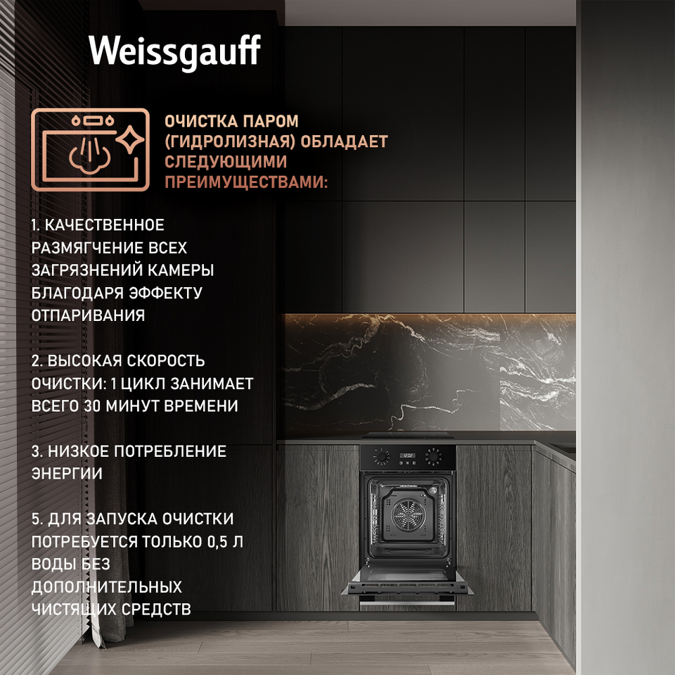 Гидролизная очистка - особая технология, благодаря который вы раз и навсегда забудете те дни, когда духовой шкаф необходимо было с большим трудом вычищать, вкладывая в это непозволительно много времени и сил. Weissgauff понимает, что в современном мире время является одной из наивысших ценностей - поэтому мы оснастили данную модель функцией гидролиза: всего лишь добавьте небольшое количество воды, и духовой шкаф сам отпарит все загрязнения, используя "эффект сауны", после чего вам останется лишь провести по стенкам мягкой губкой, собрав их и удалив одним движением.