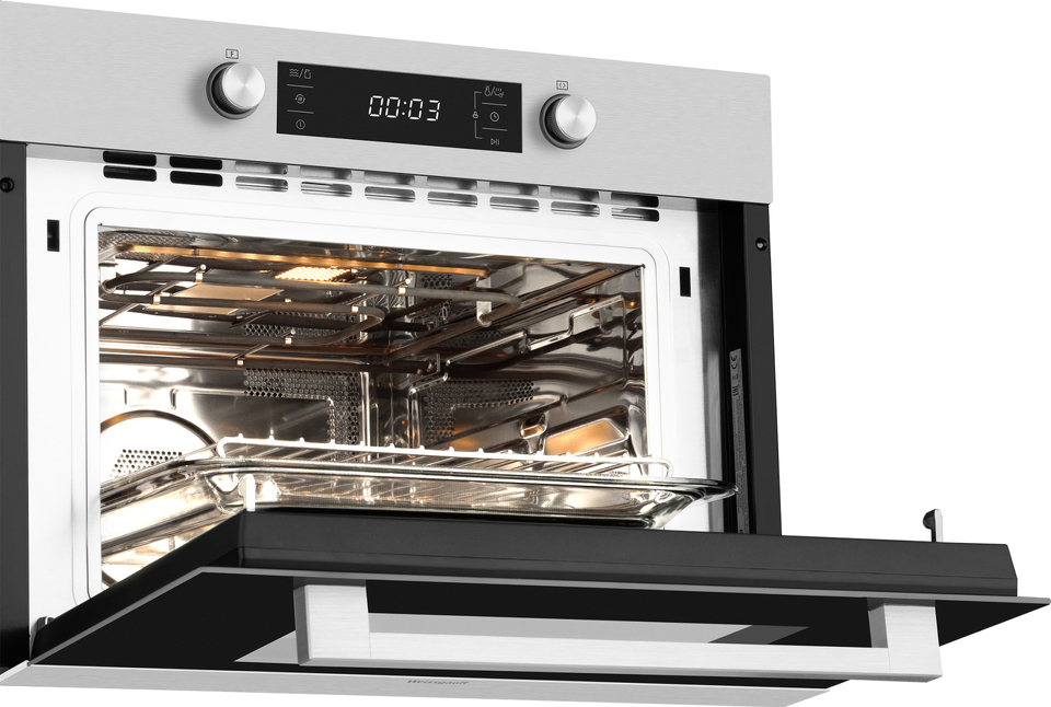 Встраиваемый компактный духовой шкаф с микроволнами , который сочетает в себе сразу два полноценных устройства: духовой шкаф с конвекцией и грилем, а также микроволновую печь с отдельными набором настроек и возможностью использования комбинированного режима.