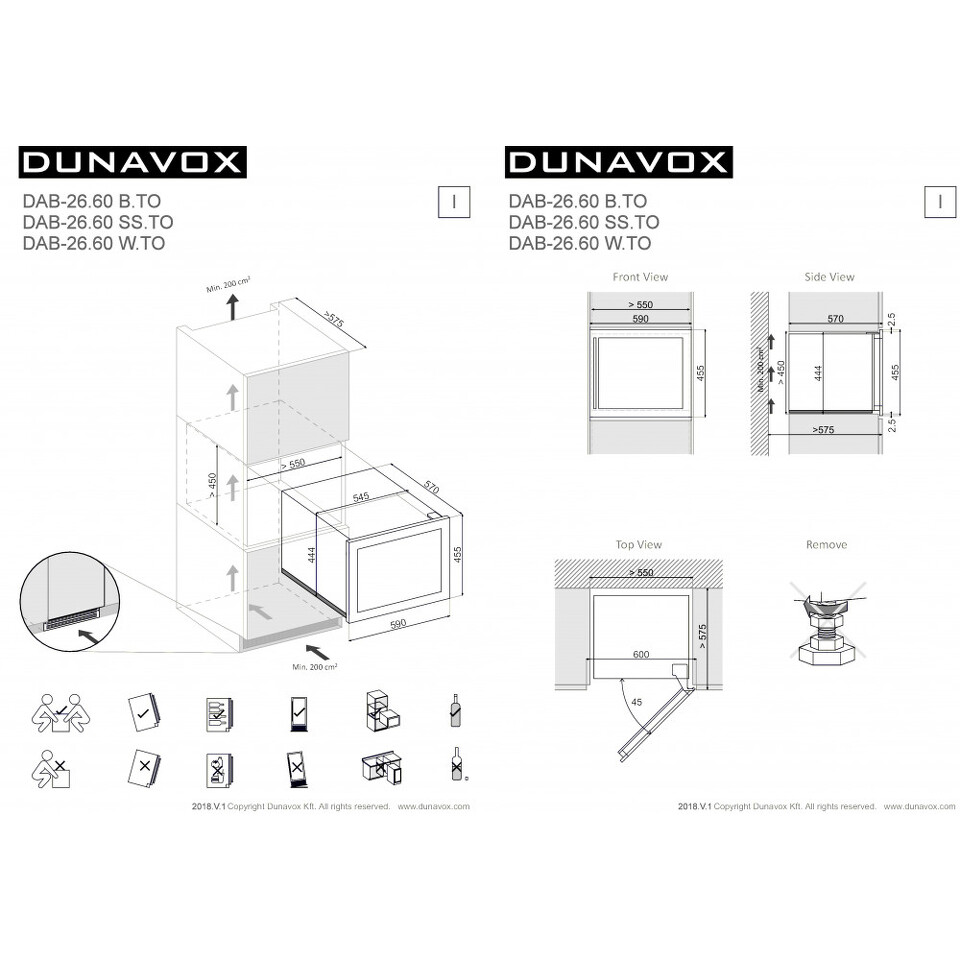 Винный шкаф Dunavox DAB-26.60SS.TOпредназначен для встраивания в нишу. Для обеспечения отвода горячего воздуха необходимо предусмотреть сквозную вентиляционную нишу площадью не менее 200 см² от цоколя до верхней части мебельного модуля.