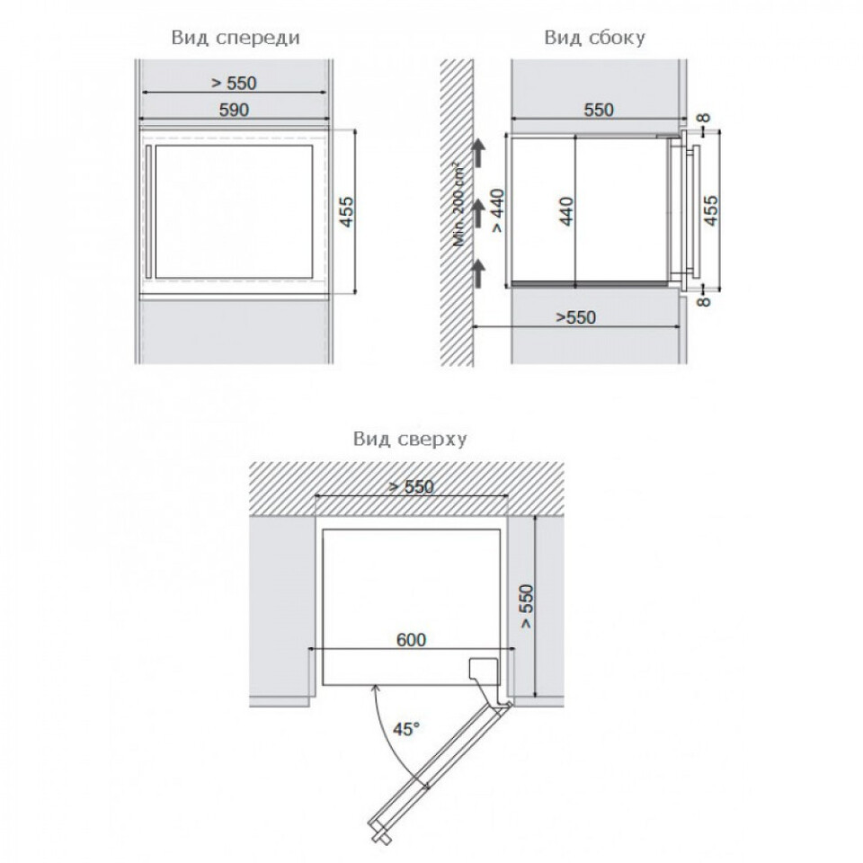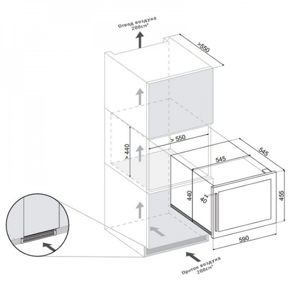 Модель DAB-28.65SS на базе малошумного компрессора имеет 1 зону охлаждения, вмещает в себя до 28 бутылок вина и создает оптимальные условия для хранения вина и подготовке к дегустации. Шкаф оснащен внутренним вентилятором для равномерного доступа холодного воздуха ко всем полкам шкафа. Комплектуется холодильник DAB-28.65SS тремя выдвижными деревянными полками, выполненными из древесины бука.Шкаф оснащен сенсорной панелью управления, с помощью которой пользователь выбирает необходимый температурный режим работы аппарата. В модель встроена функция звукового оповещения об открытой двери, для включения которой необходимо прикоснуться к кнопке питания, а отключается она в случае, когда дверь открыта более 60 секунд.В холодильнике Dunavox DAB-28.65SS встроена функция "Отдых", которая позволяет отключить дисплей, подсветку и звуковые оповещения, но при этом винный шкаф продолжит охлаждать вино. Такой режим действует 96 часов, по истечении которых автоматически отключается.В винном холодильнике Dunavox DAB-28.65SS предусмотрена возможность перевешивания двери на другую сторону, что дает дополнительное удобство при установке холодильника в подходящее по габаритам место.Корпус модели металлический с покрытием черного цвета, дверца выполнена из прозрачного двойного стеклопакета, защищенного от воздействия ультрафиолетовых лучей в рамке из полированной нержавющей стали. Ручка двери удобная, накладная, выполнена из нержавеющей стали. Цифровой индикатор температуры и внутреннее освещение на светодиодах синего цвета.Винный шкаф Dunavox DAB-28.65SS предназначен для встраивания в нишу. Для обеспечения отвода горячего воздуха необходимо предусмотреть сквозную вентиляционную нишу площадью не менее 200 см² от цоколя до верхней части мебельного модуля (см. рисунок).Рекомендуется устанавливать винный шкаф Dunavox DAB-28.65SS вдали от прямых солнечных лучей и источников тепла (духовки, нагревателя, батареи и т.д.). Прямой солнечный свет может плохо повлиять на корпус, а источники тепла могут увеличить энергопотребление. Не допускается установка аппарата рядом с плитой или прибором, который может нагревать воздух в пространстве 1-5 см от его корпуса (например, рядом схолодильником, у которого теплообменная стенка граничит с аппаратом). Не рекомендуется устанавливать прибор на полы с подогревом без специальной термоизолирующей подложки.Отличительные особенностиОдна зона охлажденияАвтоматическая система разморозки.Три деревянные полки без лакового покрытия.Компрессор с минимальным уровнем шума 39 дБ.Увеличенная до 3 лет гарантия. Функциональные особенностиДверца шкафа выполнена из двойного стеклопакета с защитой от УФ лучей в рамке из нержавеющей стали.Регулируемый температурный режим в диапазоне от +5°C до +22° позволяет хранить белые, красные и игристые вина.Внутренний вентилятор способствует равномерному распределению температуры по всему объему шкафа.Функция звукового оповещения об открытой двери.Функция "Отдых".Дверь перевешивается.Удобная сенсорная панель управления обеспечивает простую и быструю установку необходимой температуры.Светодиодная подсветка.