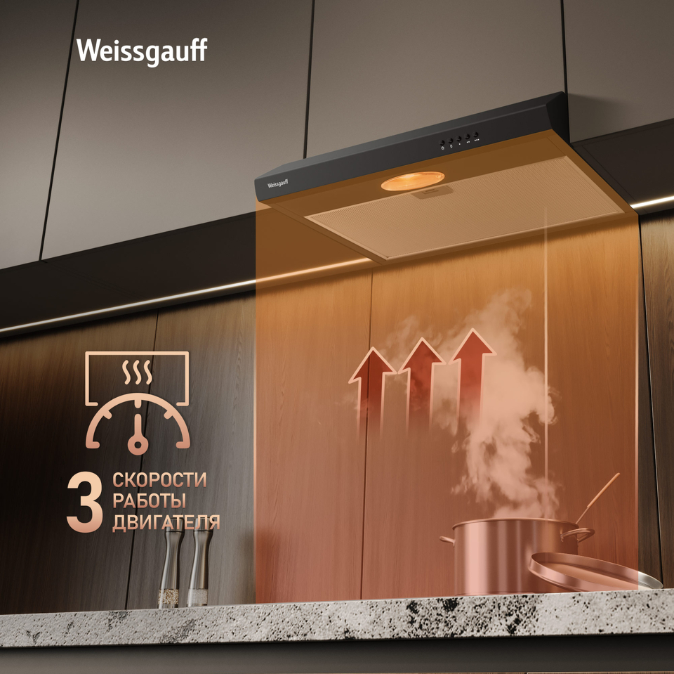Плоская кухонная вытяжка от Weissgauff, воплощающая в себе безупречный дизайн и высокую эффективность, оснащена интуитивно понятным кнопочным управлением и выполнена в дизайне черного цвета!