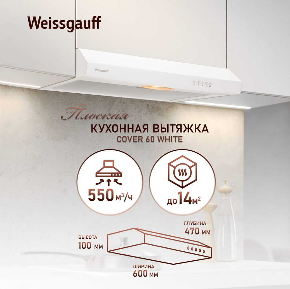 • Эффективная работа в помещении площадью до 14 м2 - это гарантия того, что после установки вытяжки Weissgauff, обновление воздуха будет соответствовать всем требуемым нормам, сохраняя ваше здоровье на долгие годы!
