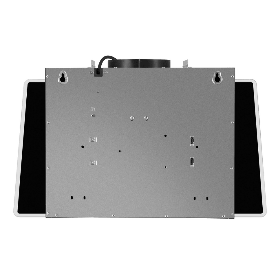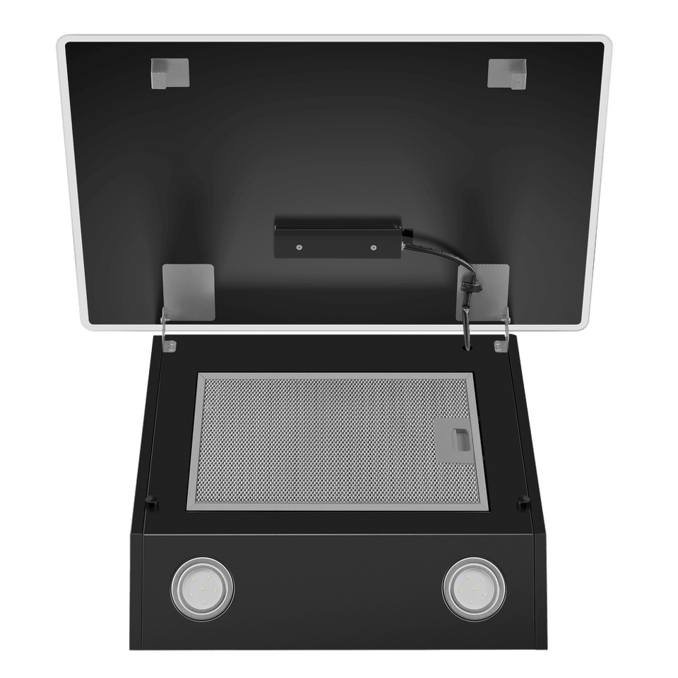 Корпус сделан из эмалированной стали. Фасад выполнен полностью из закаленного глянцевого стекла с прозрачной окантовкой. За ней скрыт алюминиевый жироулавливающий фильтр, который легко снимается и полностью разбирается для чистки. Загрязненный воздух втягивается по периметру откидной панели.
