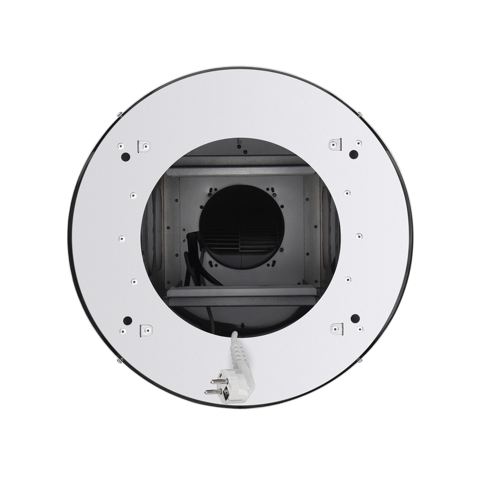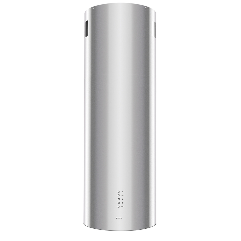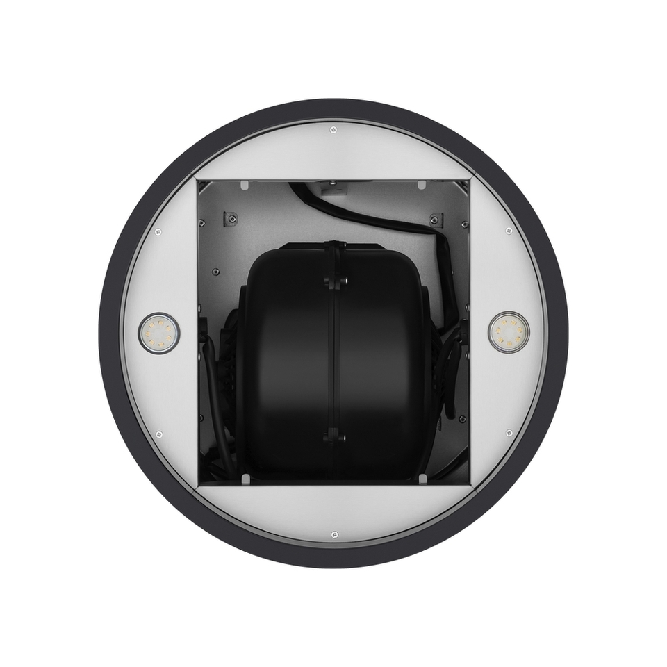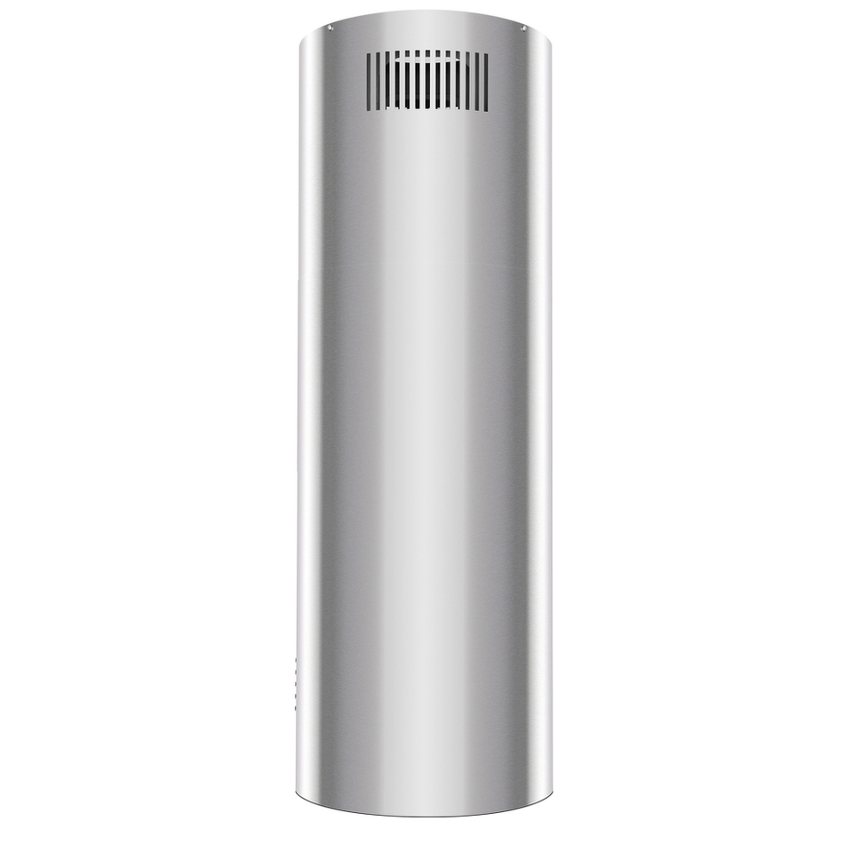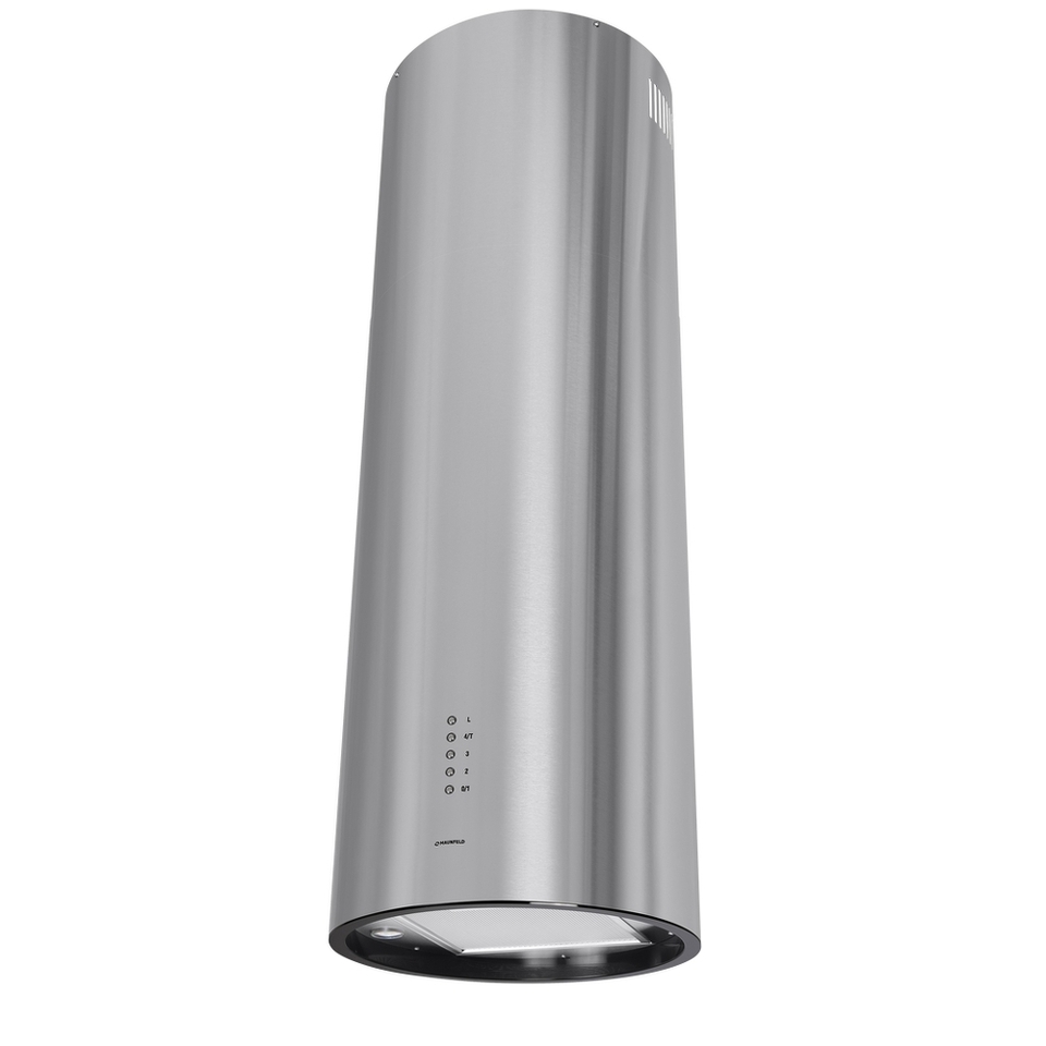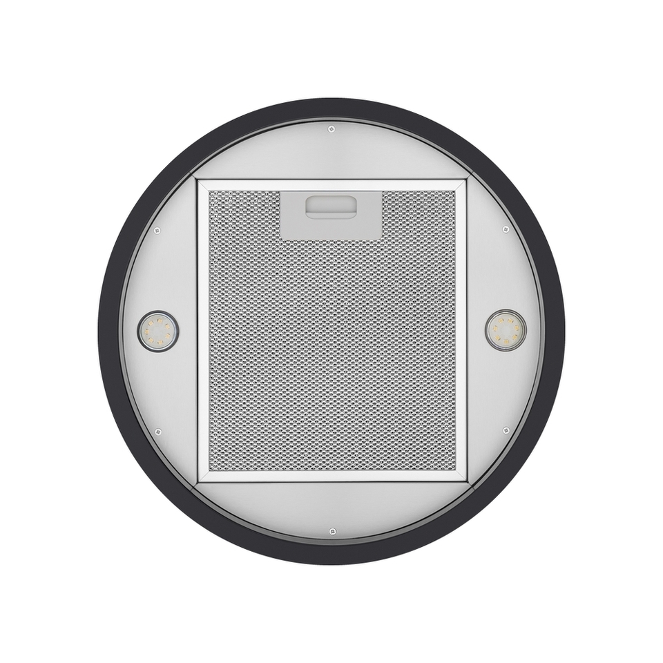 Корпус цилиндрической формы, выполненный из нержавеющей стали с термостойким покрытием, крепится на потолок над поверхностью плиты. В нижней части вытяжки находится алюминиевый многослойный жироулавливающий фильтр. Он легко вынимается и полностью разбирается, что сильно упрощает чистку.
