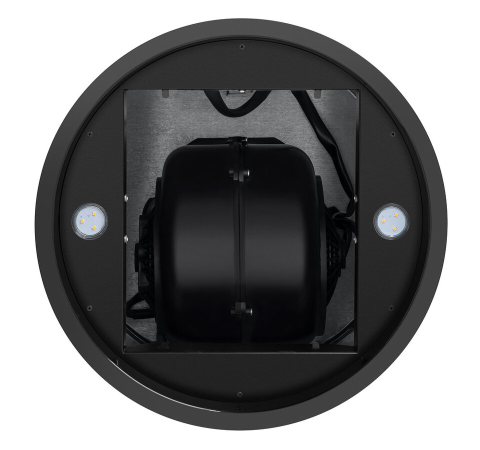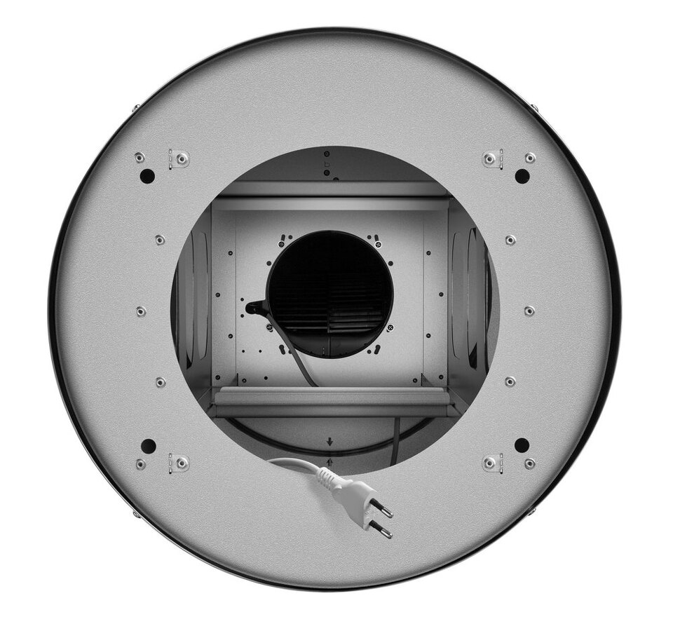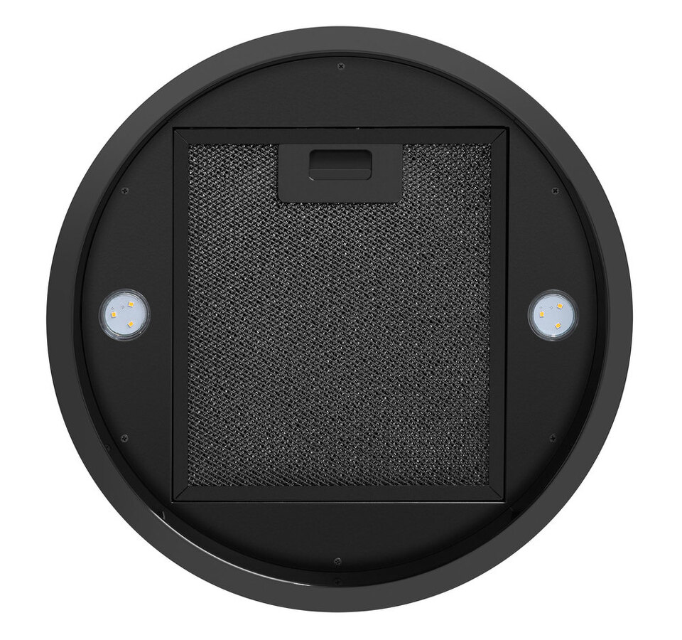 Корпус цилиндрической формы, выполненный из нержавеющей стали с термостойким покрытием, крепится на потолок над поверхностью плиты. В нижней части вытяжки находится алюминиевый многослойный жироулавливающий фильтр. Он легко вынимается и полностью разбирается, что сильно упрощает чистку.
