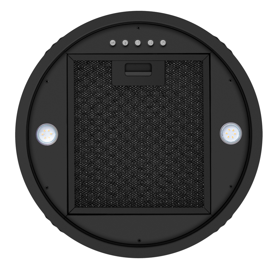 Корпус цилиндрической формы, выполненный из нержавеющей стали с термостойким покрытием, крепится на потолок над поверхностью плиты. В нижней части вытяжки находится алюминиевый многослойный жироулавливающий фильтр. Он легко вынимается и полностью разбирается, что сильно упрощает чистку.