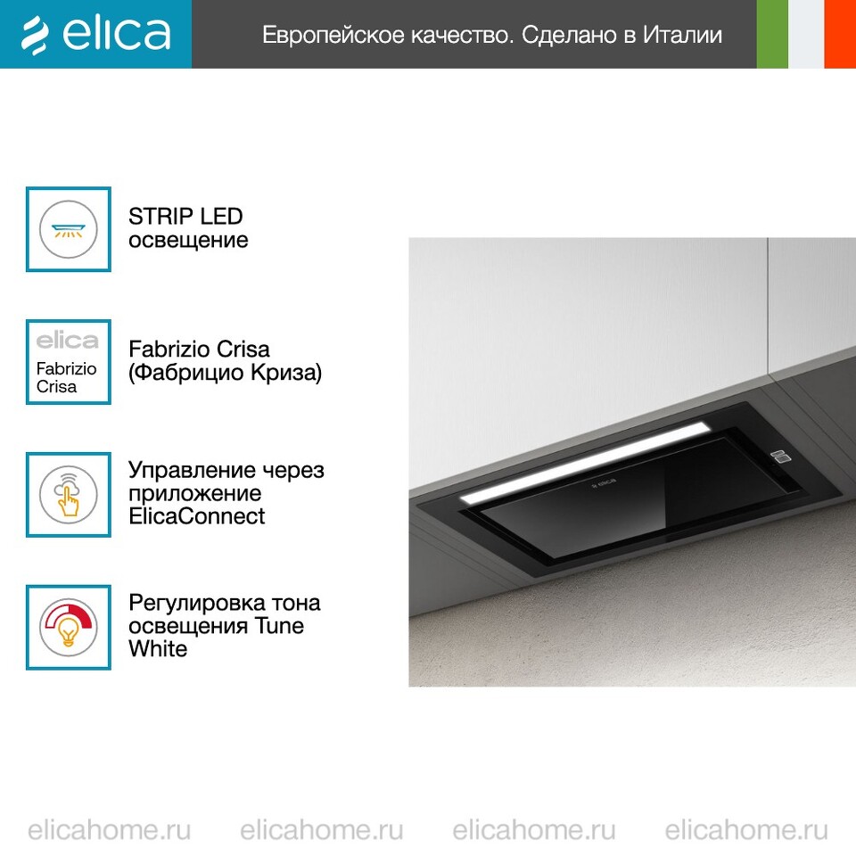 В вытяжке Элика HIDDEN 2.0 @ BLGL/A/72 предусмотрена уникальная система светодиодной подсветки, которая позволяет регулировать ее интенсивность в зависимости от необходимости, увеличивая или убавляя яркость. Кроме этого, можно даже задать оттенок света, сделав его более теплым или холодным.