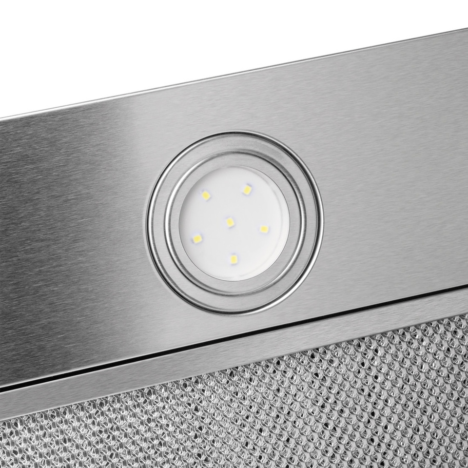 Мощная встраиваемая вытяжка шириной 60 см выполнена из нержавеющей стали. Электронное управление и LED подсветка.