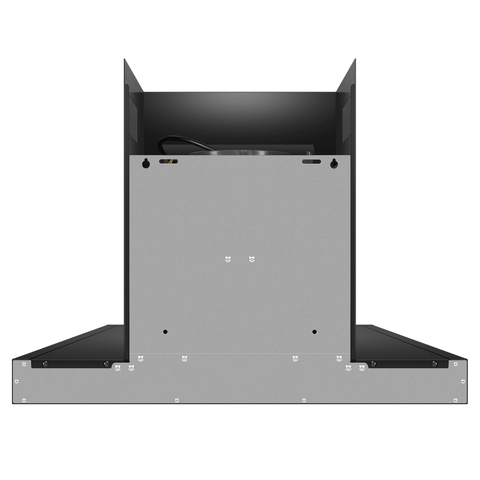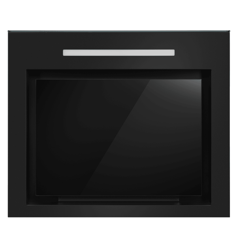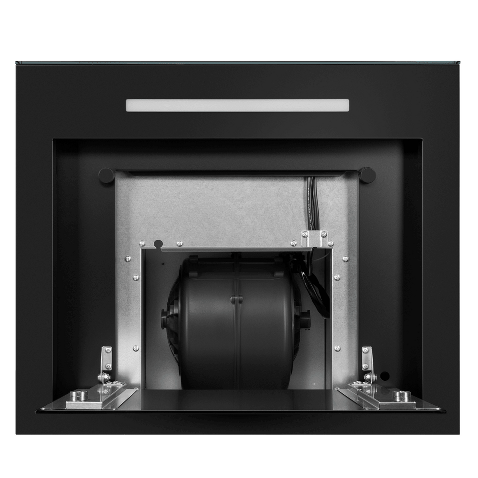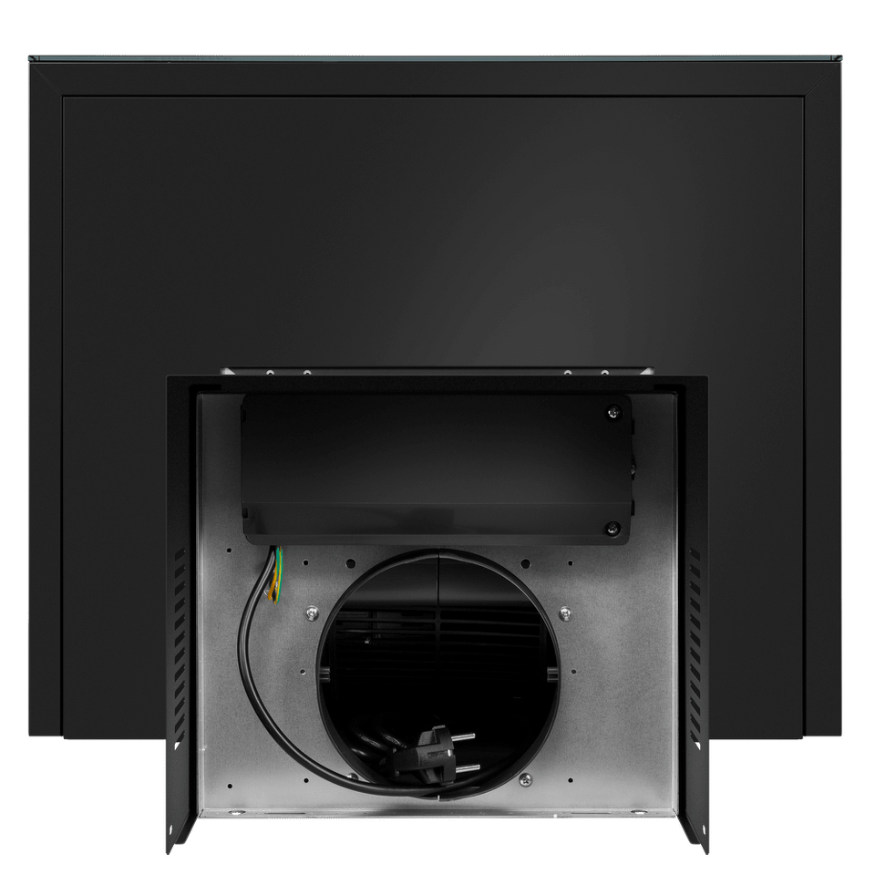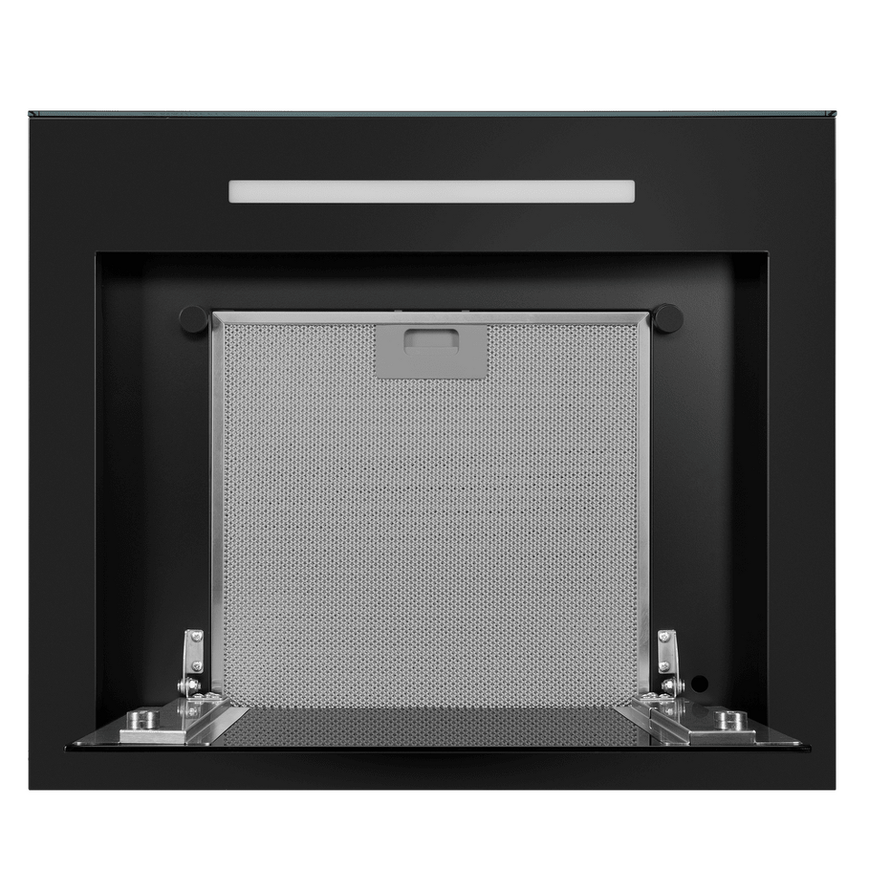 Изящная вытяжка, выполненная в черном цвете, имеет минималистичный дизайн, что делает модель идеальной для встраивания в современный кухонный интерьер. Рабочая поверхность и фасад выполнены из глянцевого закаленного стекла/