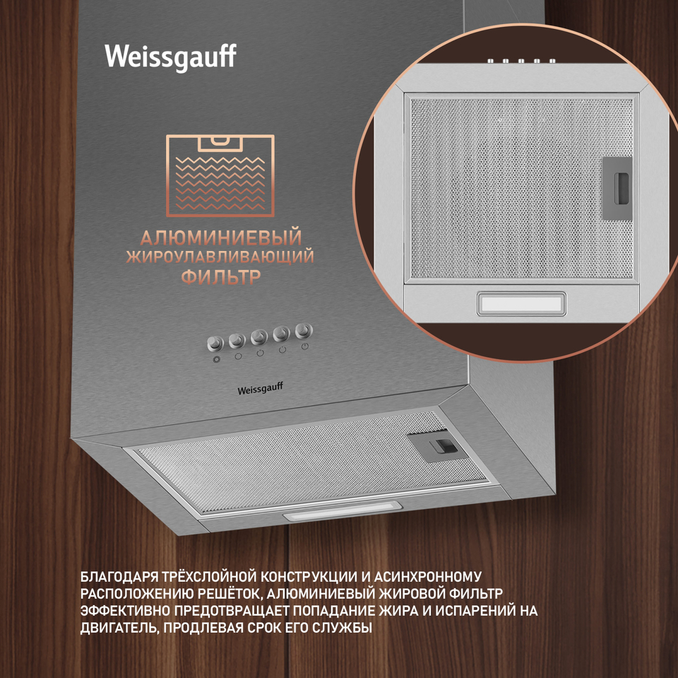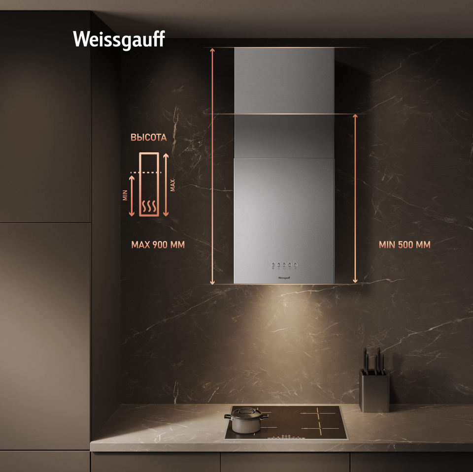 Эффективная работа в помещении площадью до 27 м2 - это гарантия того, что после установки вытяжки Weissgauff, обновление воздуха будет соответствовать всем требуемым нормам, сохраняя ваше здоровье на долгие годы!