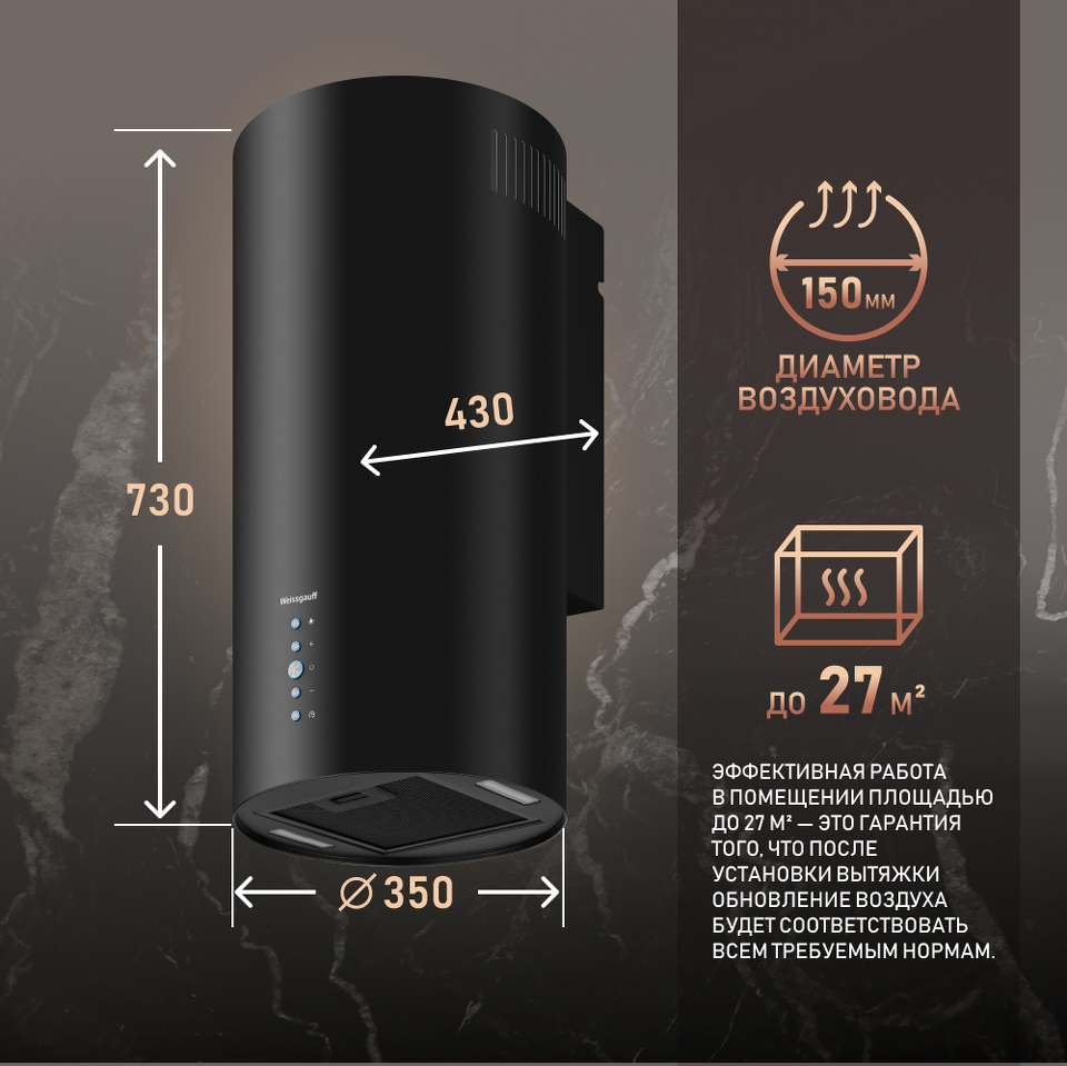 Эффективная работа в помещении площадью до 27 м2 - это гарантия того, что после установки вытяжки Weissgauff, обновление воздуха будет соответствовать всем требуемым нормам, сохраняя ваше здоровье на долгие годы!