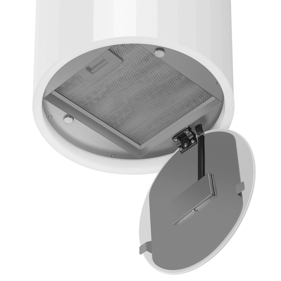 Дизайн вытяжки эффектно выделяется рельефными полосами вдоль цилиндрического корпуса и запоминающейся стеклянной панелью, выполненной в соответствии со всеми тенденциями рынка бытовой техники.