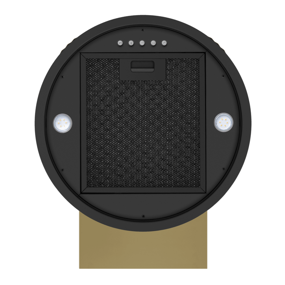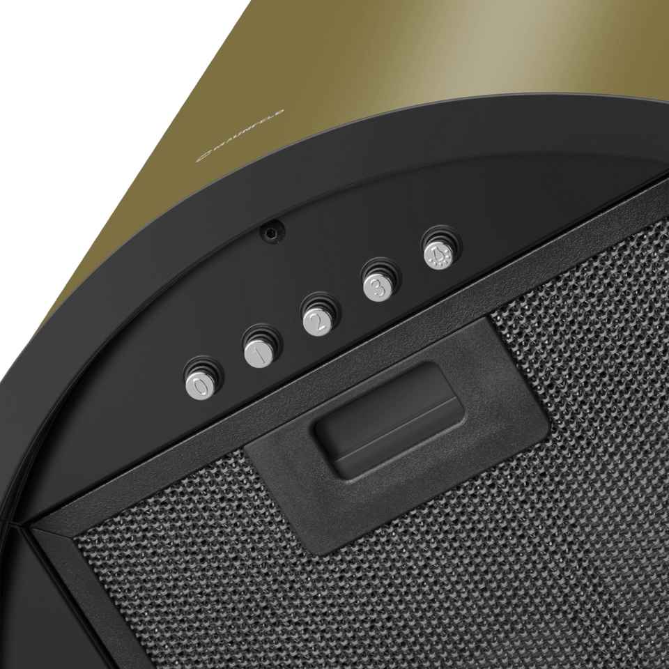 Дизайн вытяжки эффектно выделяется парой рельефных полос вдоль цилиндрического корпуса и запоминающейся скрытой панелью управления, выполненной в соответствии со всеми тенденциями рынка бытовой техники.