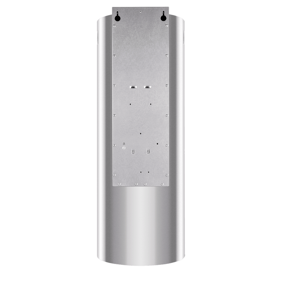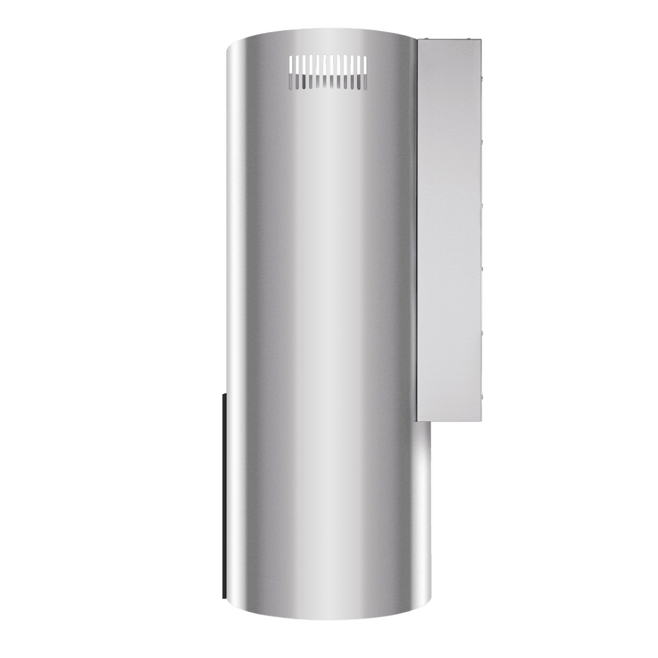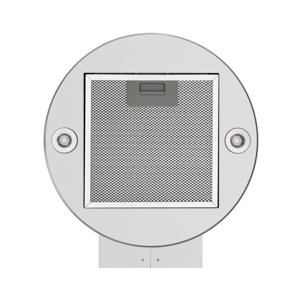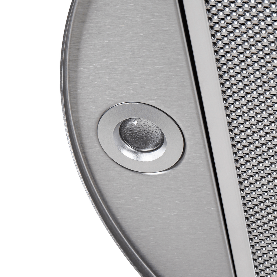Корпус цилиндрической формы, выполненный из нержавеющей стали с термостойким покрытием, устанавливается на стену над поверхностью плиты. Алюминиевый многослойный жироулавливающий фильтр находится в нижнем торце вытяжки.