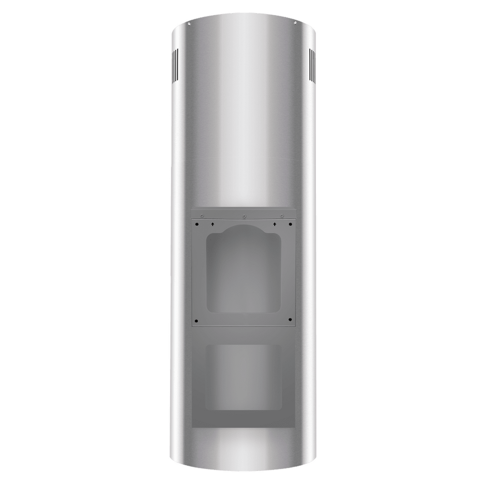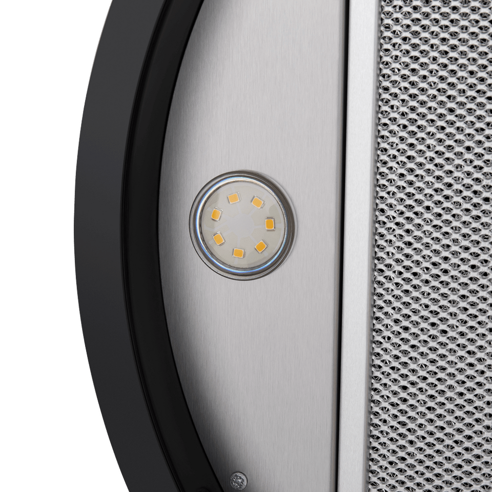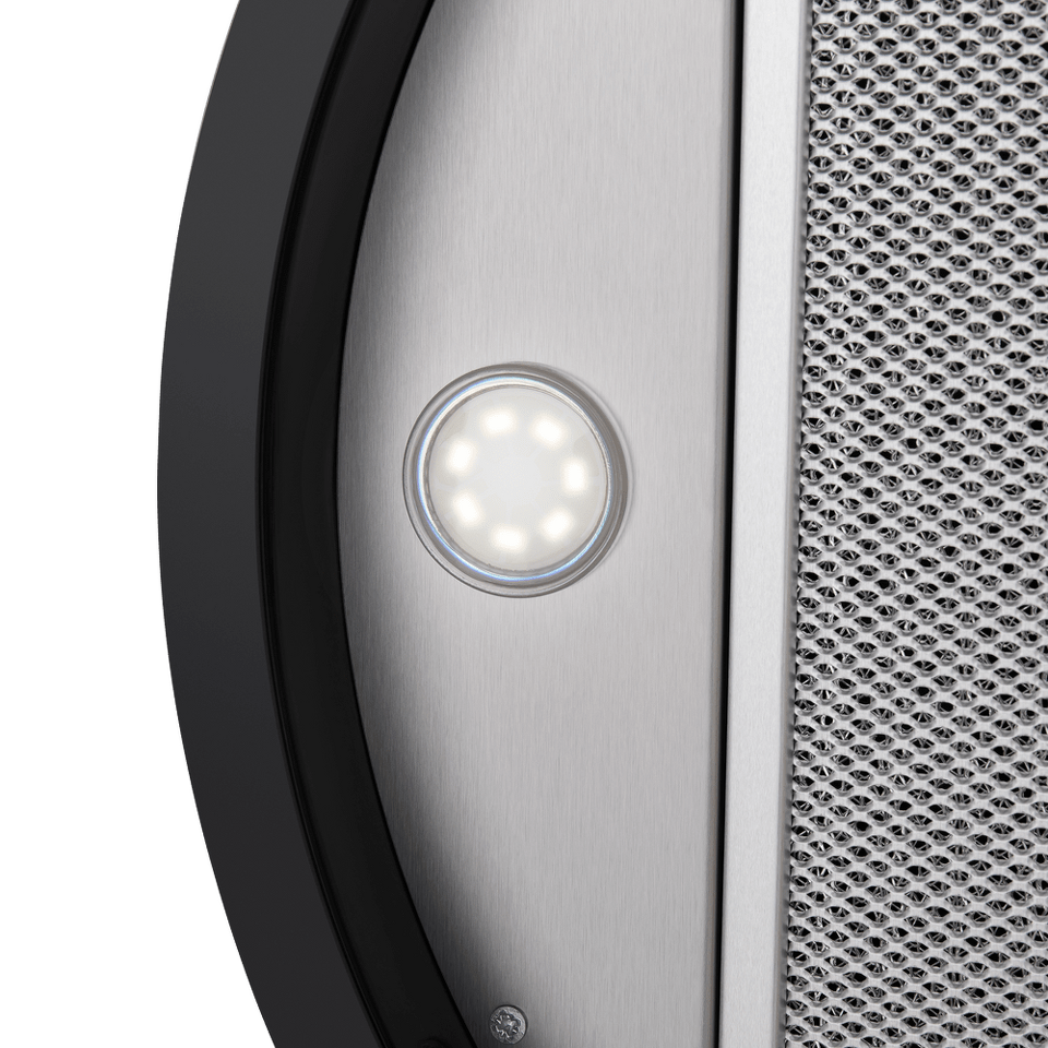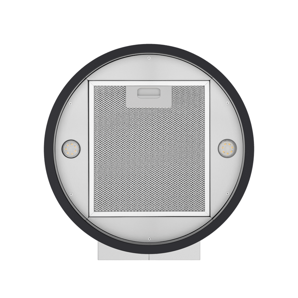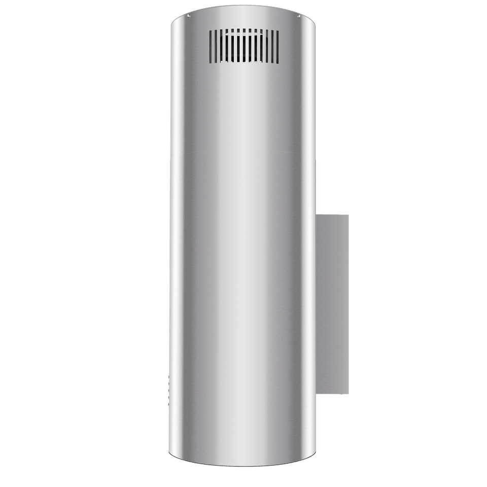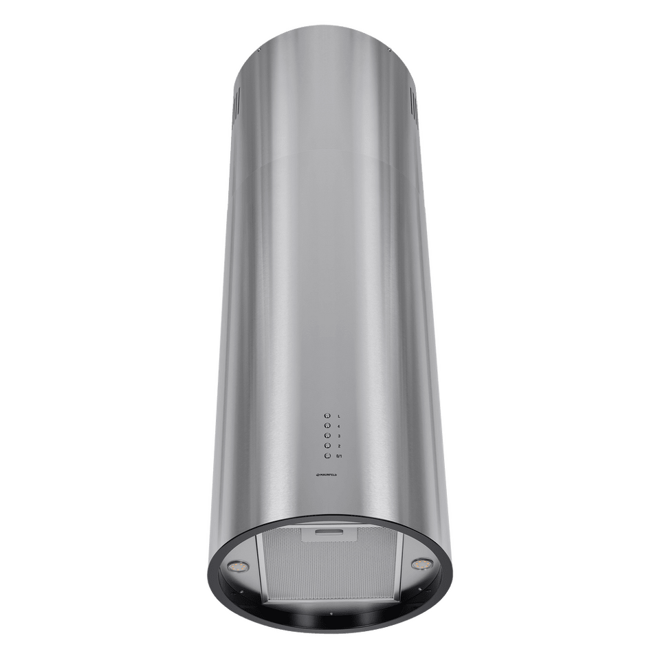 Корпус цилиндрической формы, сделанный из нержавеющей стали с термостойким покрытием, монтируется на стену над варочной поверхностью. Специальный многослойный жироулавливающий алюминиевый фильтр, расположенный в нижнем торце, легко снимается и полностью разбирается, что сильно упрощает его чистку.