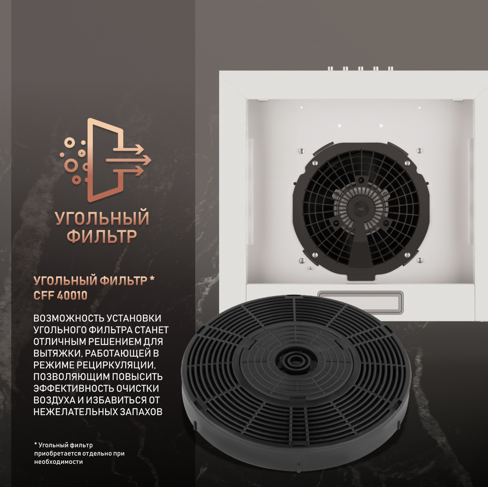 Возможность установки угольного фильтра станет отличным решением для вытяжки, работающей в режиме рециркуляции, позволяющим повысить эффективность очистки воздуха и избавиться от нежелательных запахов!